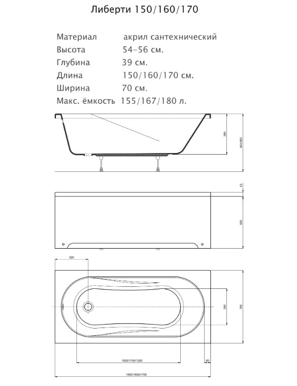 Акриловая ванна Aquatek (Акватек) Либерти 160x70, с каркасом