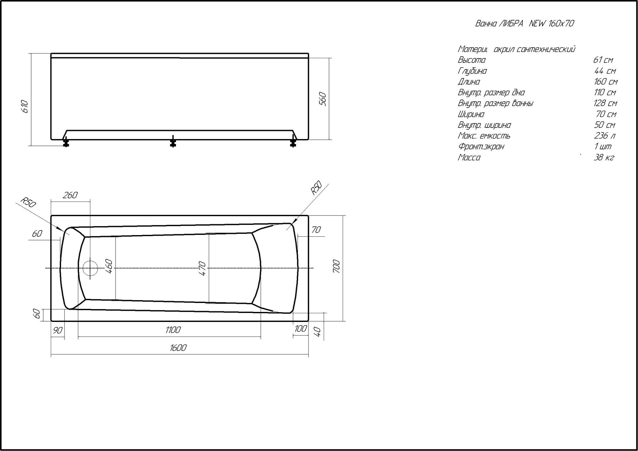 Акриловая ванна Aquatek (Акватек) Либра New 160х70, с каркасом, с фронтальной панелью, со сливом-переливом
