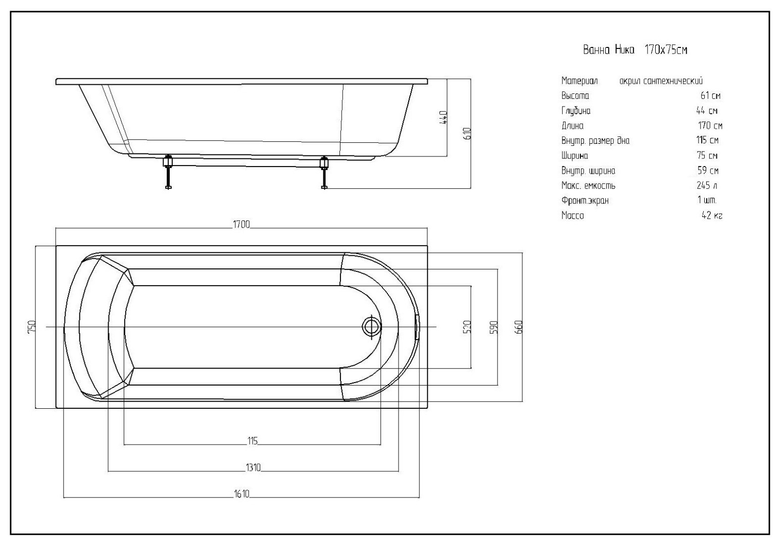 Акриловая ванна Aquatek (Акватек) Ника 170x75, с каркасом