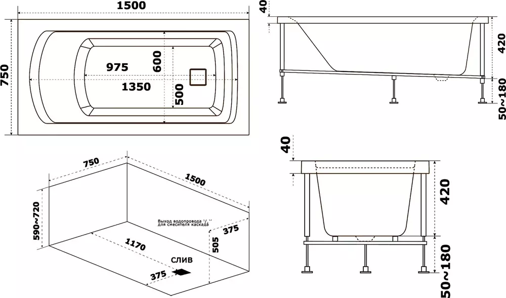 - Ванна изготовлена из литьевого акрила с усиленным армирующим слоем по всей внутренней поверхности, цвет - белый.
