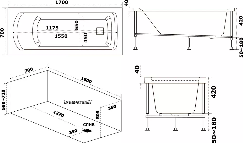 - Ванна изготовлена из литьевого акрила с усиленным армирующим слоем по всей внутренней поверхности, цвет - белый.