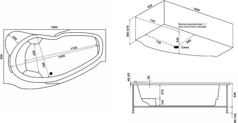 - Ванна изготовлена из литьевого акрила с усиленным армирующим слоем по всей внутренней поверхности, цвет - белый.