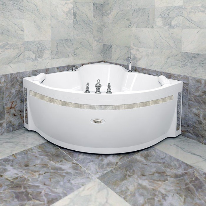 Акриловая ванна "Сорренто" 130х130 отличается практичной формой и анатомическим внутренним строением. Благодаря угловой конструкции изделие компактно размещается в ванной комнате любой планировки, выглядит очень элегантно и позволяет вместить сразу двоих. Занять удобное положение в ванне помогают наклонные спинки, эргономичные съемные подголовники и отформованные выступы внутри чаши, которые играют роль подлокотников для рук. Широкие возможности декоративной отделки позволяют купить угловую ванну с уникальным дизайном.