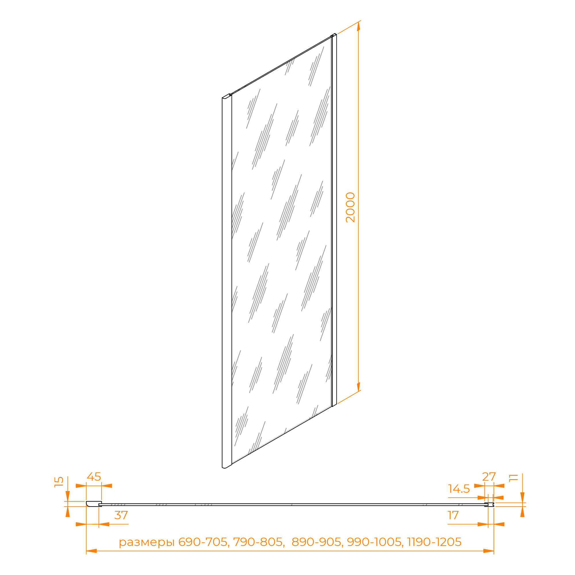 Боковая панель совместима с моделями душевых дверей высотой 2000 мм.