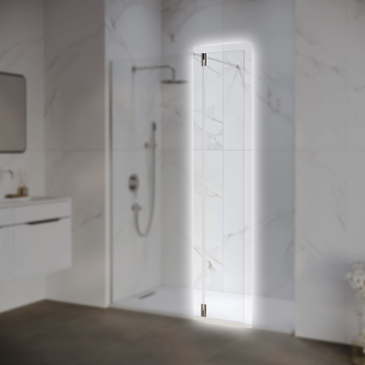 Высокопрочное закалённое приставное стекло 6 мм (z-070) комплектуется стальными петлями для крепления к стеклу перегородки. Петли оснащены герметичным поворотным механизмом с маятниковой системой, что позволяет открывать стекло наружу для удобного доступа в душевое пространство или закрывать его внутрь, частично ограничивая вход для предотвращения брызг во время водных процедур.