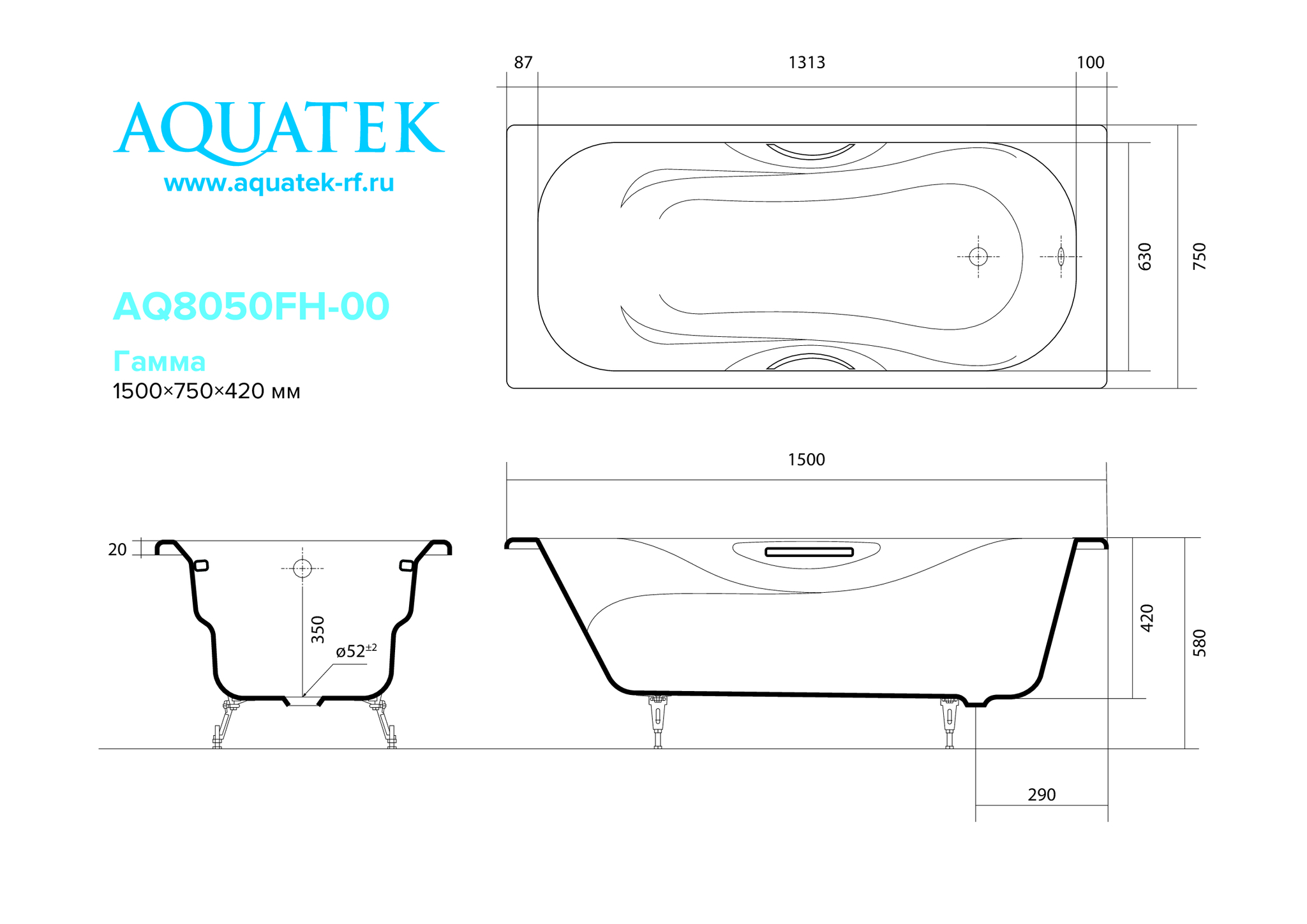 Чугунная ванна Aquatek (Акватек) Гамма 150x75, с ручками и ножками