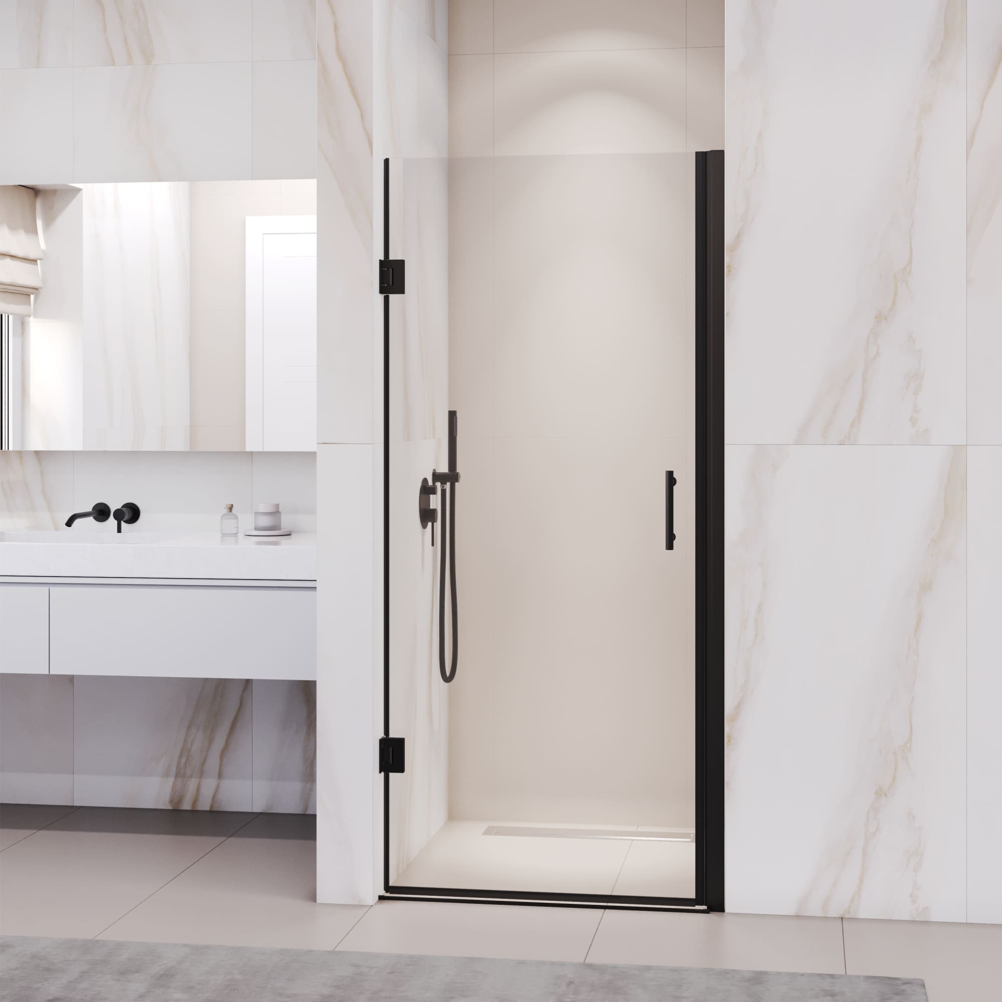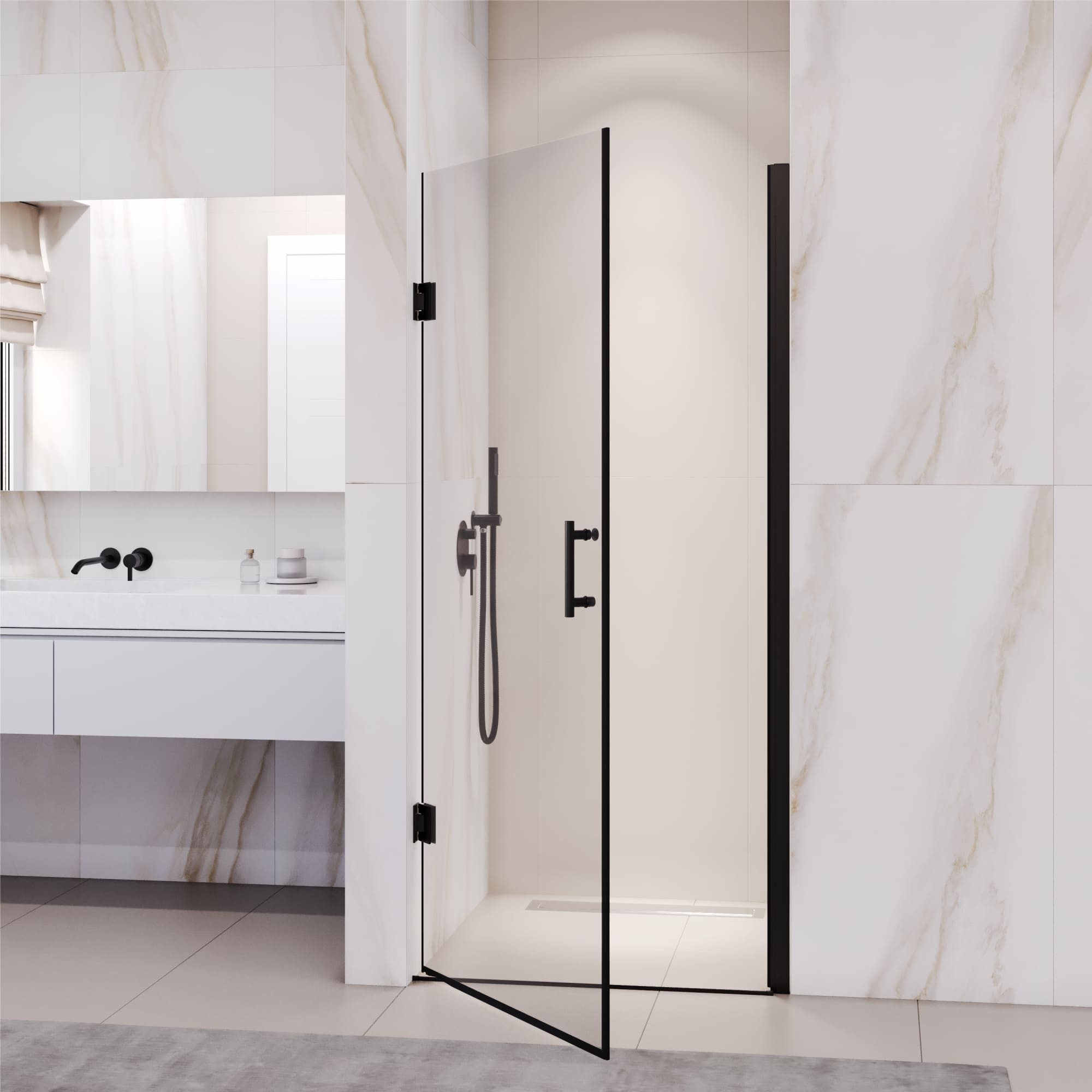 Душевая дверь состоит из одного полотна стекла «Дверь», при открытии образует широкий и свободный проход, благодаря двум элегантным прямоугольным петлям типа стена-стекло.