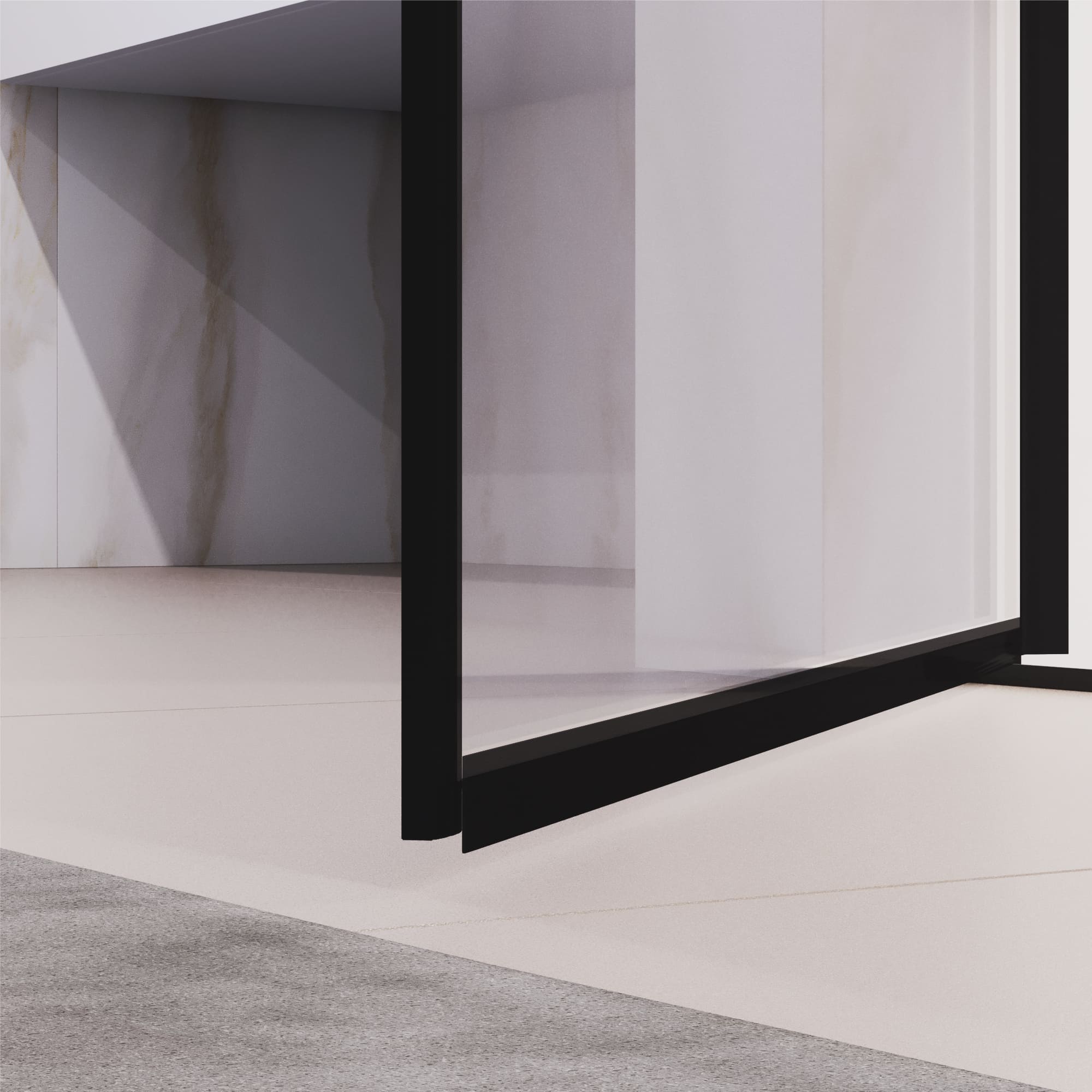 Модель бескаркасная, не имеет верхнего профиля - преимущество в свободном входе, идеальное решение для людей с высоким ростом, стильная, не требует индивидуального проекта, так как имеет регулировку по профилю до 20 мм от номинального размера, и доступная по цене.