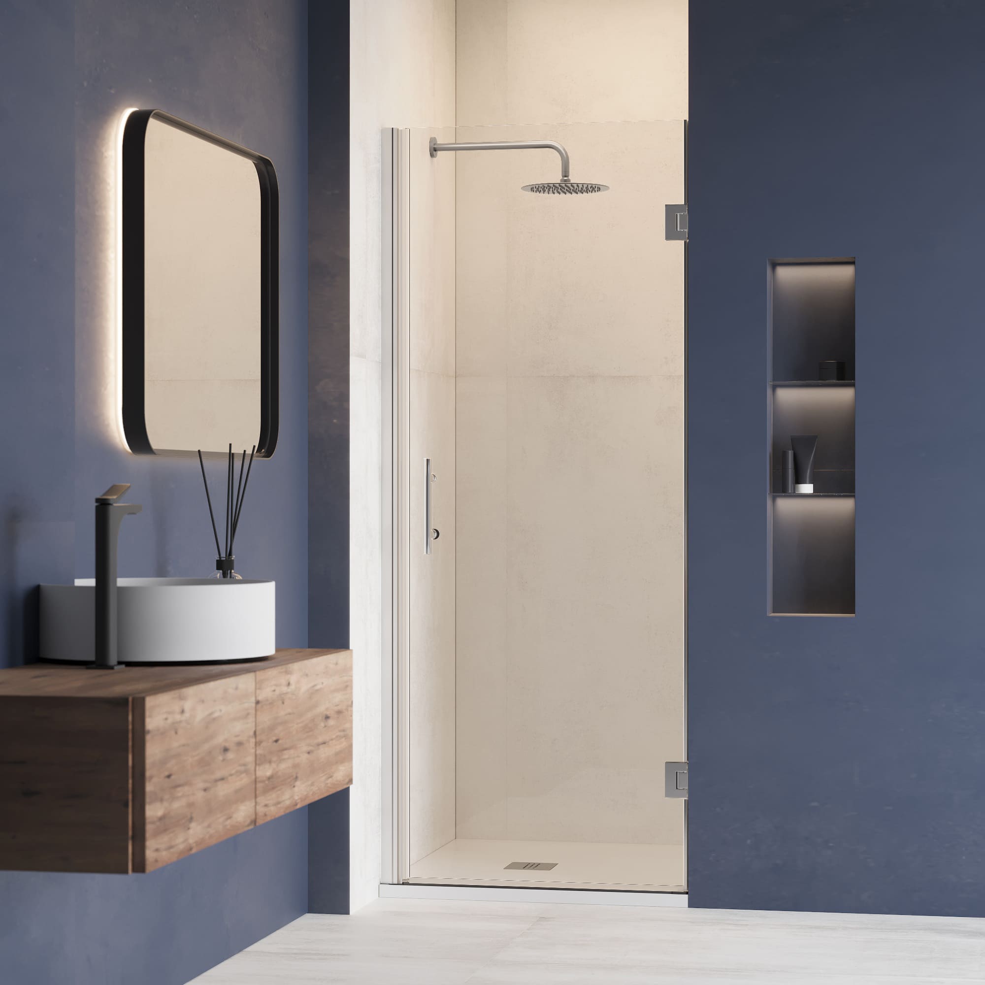 Конструкция двери для душа в нишу безрамная, то есть бескаркасная, не имеет верхнего профиля – это её преимущество: свободный вход, свободный размер высоты. Душевая дверь состоит из одного полотна стекла «Дверь», при открытии образует широкий и свободный проход благодаря двум элегантным прямоугольным петлям типа «Wall - Glass» (стена-стекло).