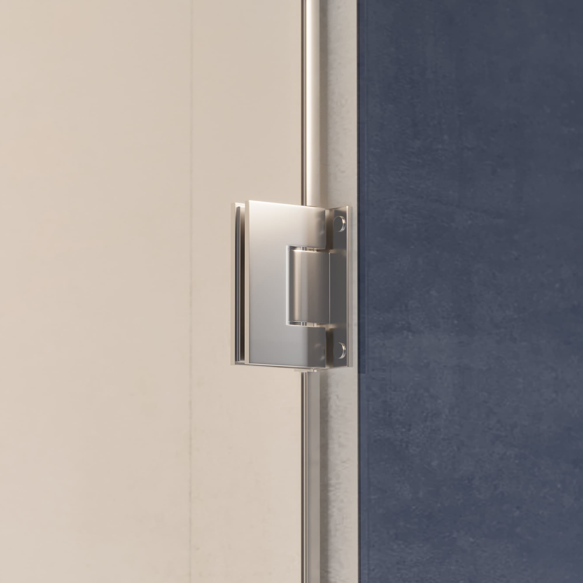 Подвижное полотно стекла крепится усиленными коннекторными петлями непосредственно к стене. Петли горизонтальные стеновые (коннекторные) под вырез в закалённом стекле. Стеновые петли из нержавеющей стали обеспечивают плавный и надёжный маятниковый ход створки, что позволяет на этапе монтажа выбрать открытие двери только вовнутрь или только наружу. Если магнитный замок не установлен, то петли позволяют открывать дверь в обе стороны. Усиленные петли гарантируют прочное крепление стекла и исключают люфты. Именно у этой модели стальные петли водонепроницаемые — они гарантируют отсутствие протечек. Петли можно установить как на левую сторону стены, так и на правую.