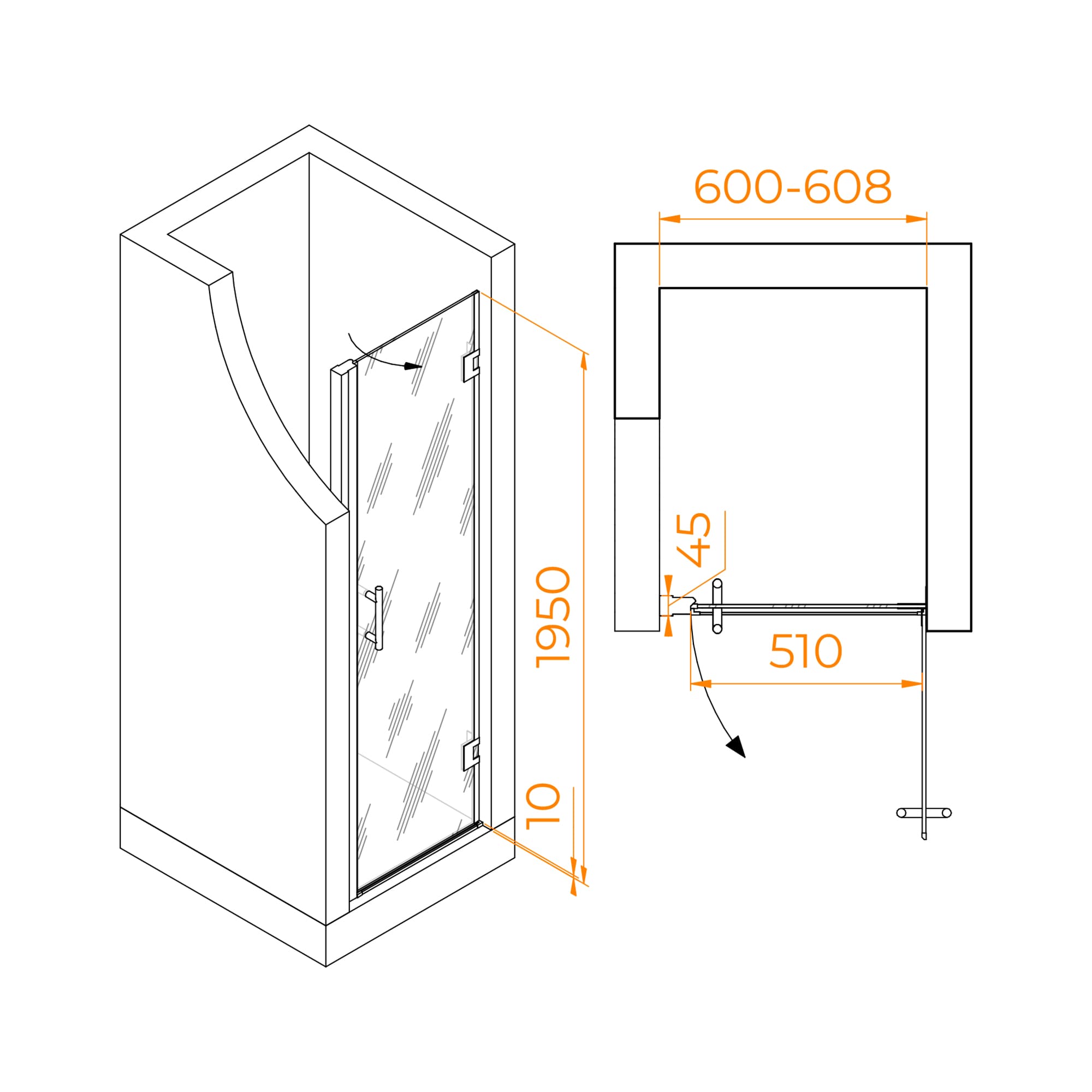 Модель RGW HO-011B душевая дверь высотой 1950 мм — евростандарт высоты изделия данного типа. При желании увеличить или уменьшить высоту полотна двери, вы можете заказать индивидуальный проект под вашу душевую кабину.