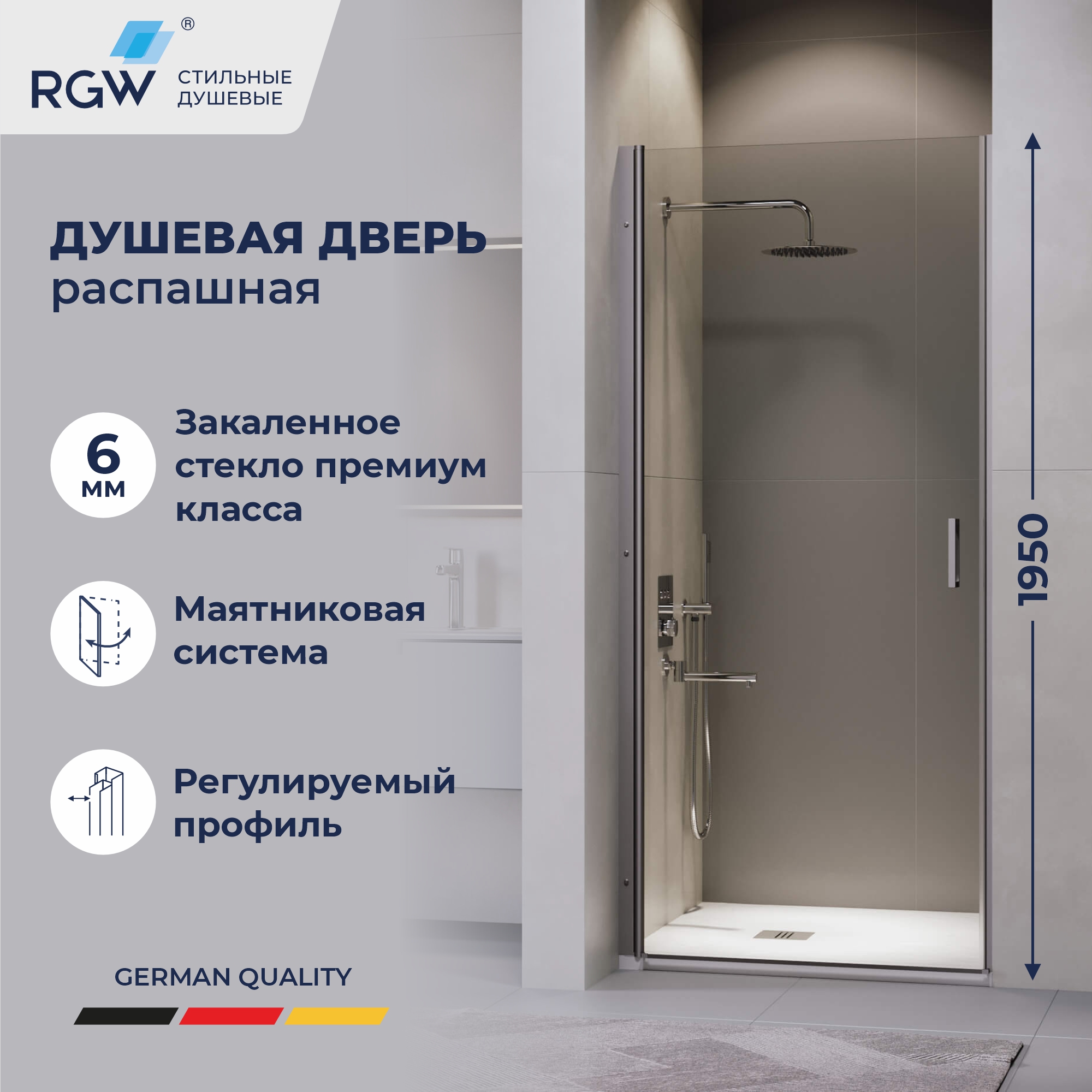 Душевая дверь изготовлена из стекла толщиной 6 мм, обеспечивающего превосходную прочность и долговечность. Прозрачный цвет стекла создает современный и открытый вид, а серый цвет профиля добавляет нотку элегантности. Общая высота двери составляет 1950 мм, что делает ее подходящей для большинства стандартных душевых кабин.