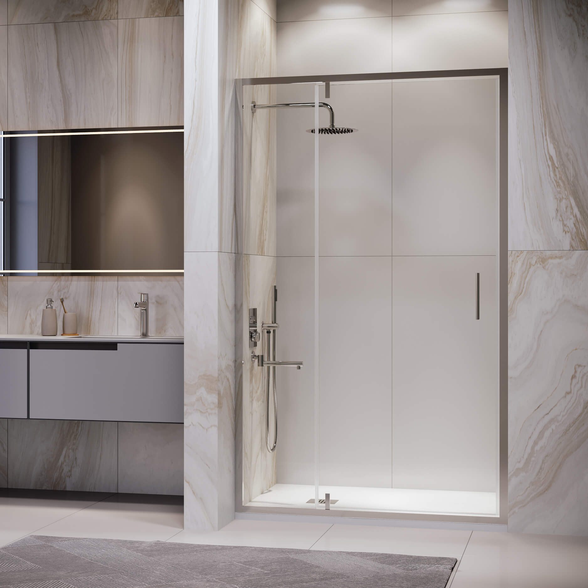 Конструкция распашных маятниковых дверей позволяет высвобождать пространство, не занимая лишнего места в ванной комнате, так как они могут открываться как внутрь, так и наружу. Стекло с покрытием анти капля Easy Clean минимизирует образование водяных капель и облегчает уход за дверью.