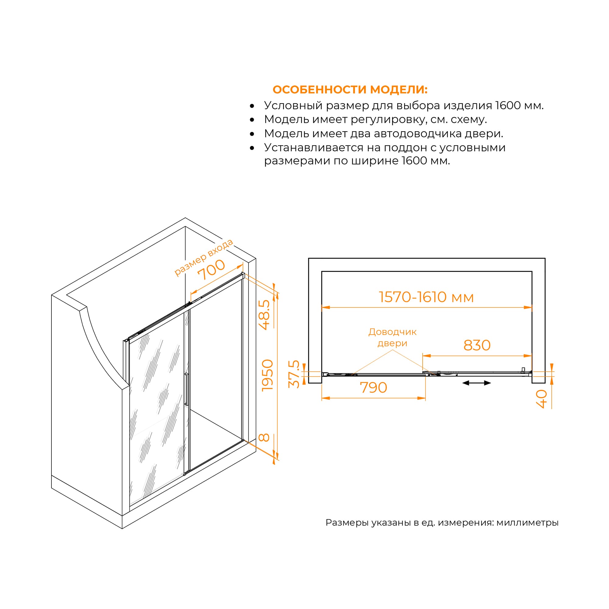 Эта душевая дверь общей высотой 1950 мм обеспечивает достаточное прикрытие и конфиденциальность. Двойные регулируемые ролики делают открытие и закрытие двери плавным и легким. Второй класс герметичности гарантирует, что вода останется внутри душа, сохраняя пол в ванной комнате сухим.