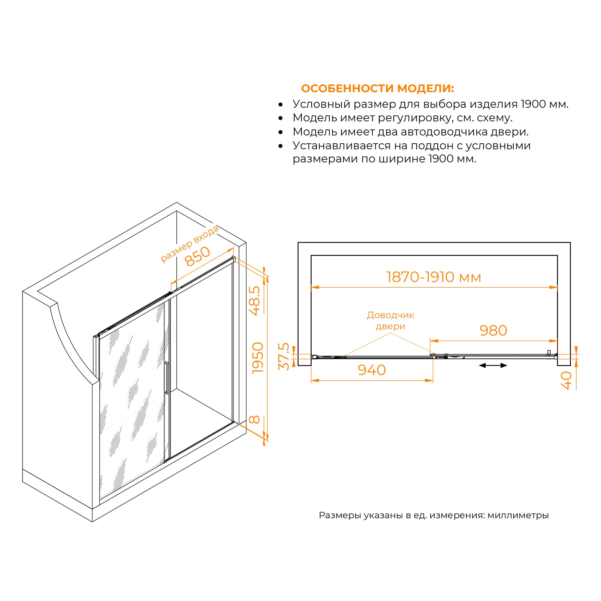 Эта душевая дверь общей высотой 1950 мм обеспечивает достаточное прикрытие и конфиденциальность. Двойные регулируемые ролики делают открытие и закрытие двери плавным и легким. Второй класс герметичности гарантирует, что вода останется внутри душа, сохраняя пол в ванной комнате сухим.