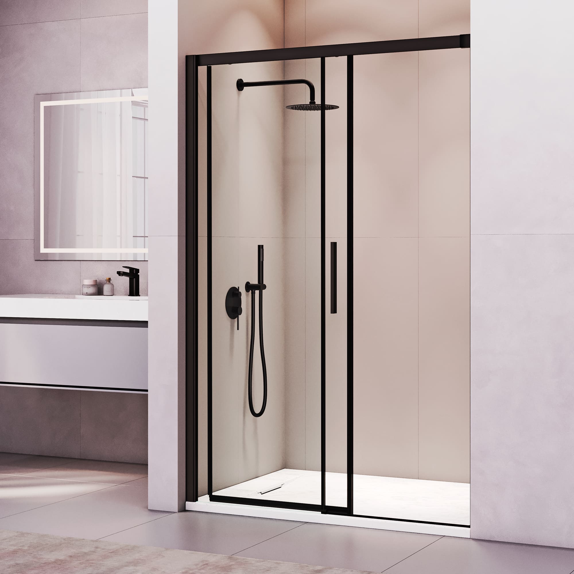 Высота общая двери составляет 1950 мм, что позволяет использовать ее даже в помещениях с высокими потолками. Двойные регулируемые ролики обеспечивают плавное и бесшумное скольжение двери при открытии и закрытии. Конструкция дверей раздвижная, что позволяет сэкономить место в ванной комнате.