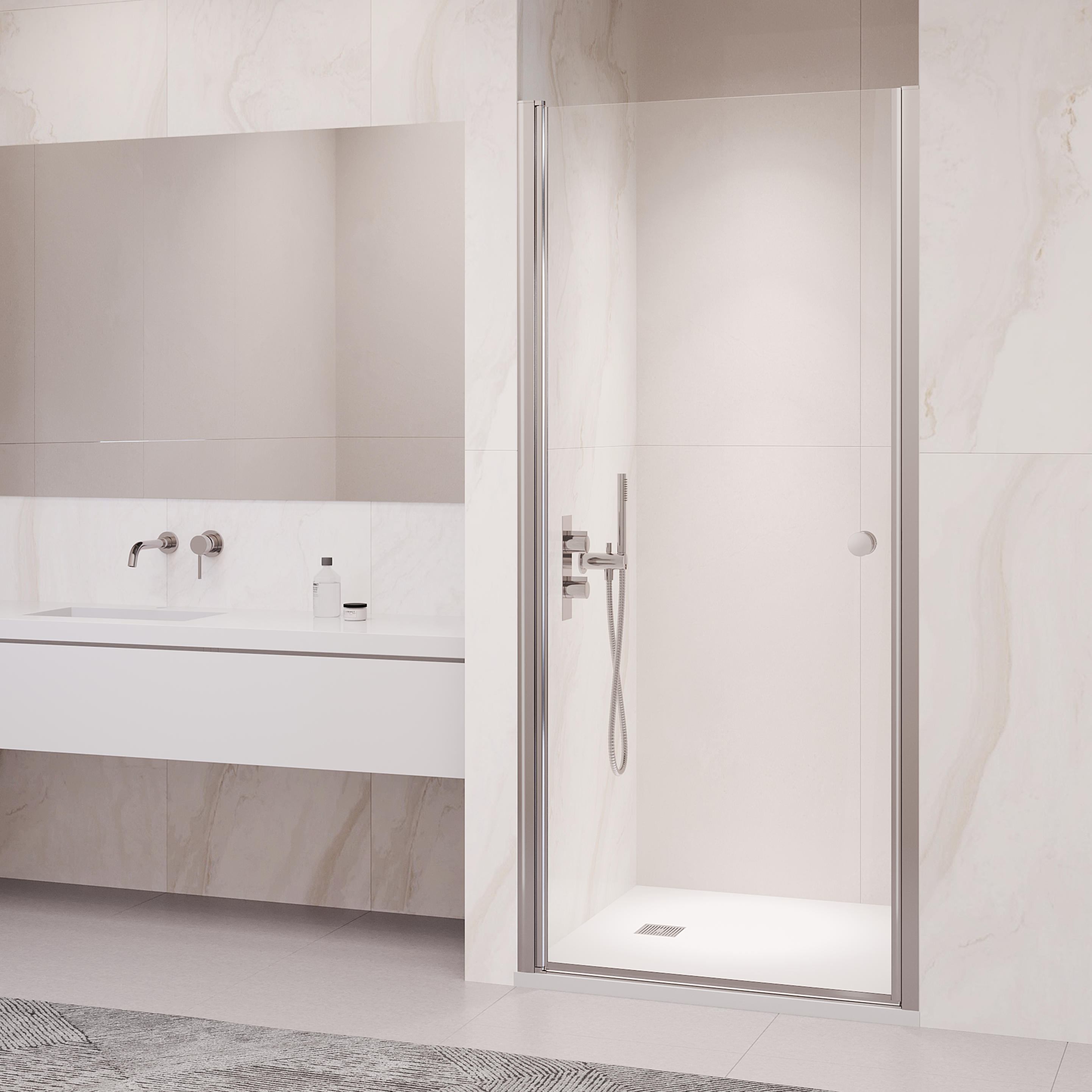 Регулируемый профиль душевой двери позволяет легко установить и настроить ее в соответствии с вашим конкретным душевым пространством. Роликовые подшипники обеспечивают плавную и бесшумную работу двери, повышая общую функциональность и удобство для пользователя.