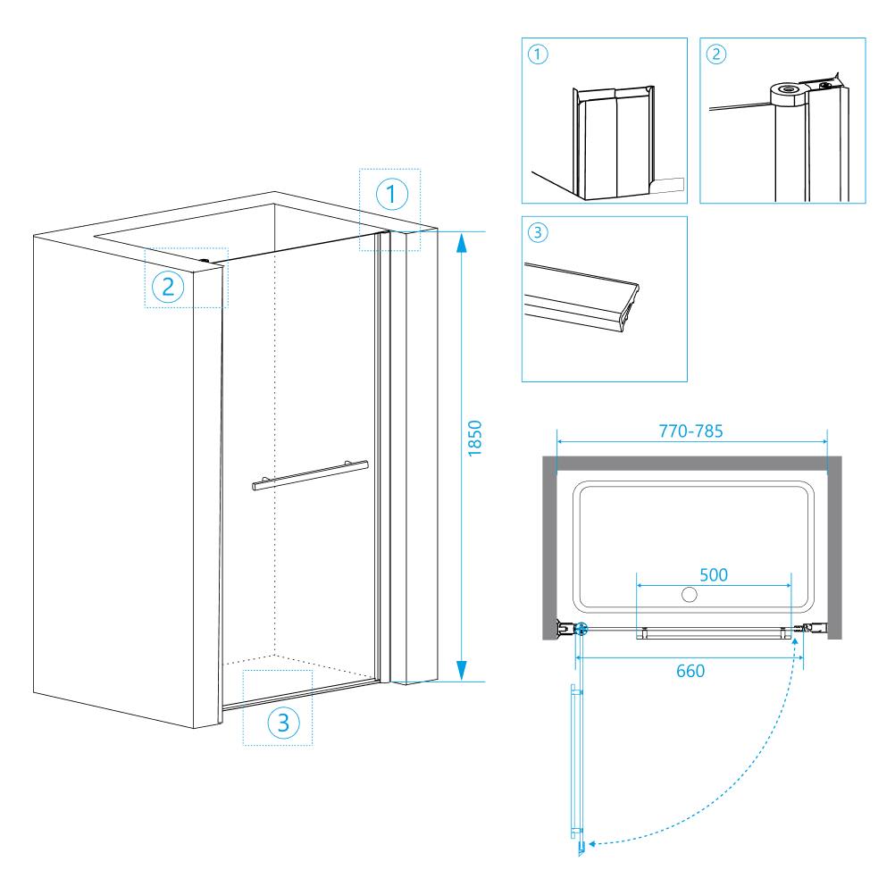 Эта душевая дверь общей высотой 1850 мм подходит для большинства ванных комнат, обеспечивая достаточно места и комфорта. Класс герметичности 2 гарантирует, что вода останется в душевой зоне, предотвращая нежелательное повреждение пола ванной комнаты водой.