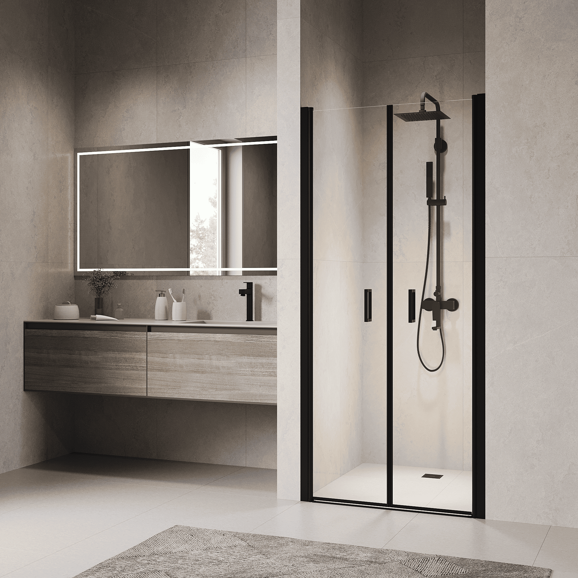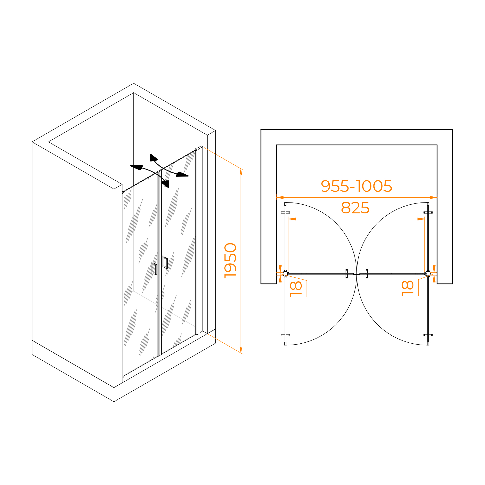 Двух створчатая маятниковая душевая дверь PA-104 с механизмом "Gravity Loop" представлена в популярных цветовых решениях: хром, черный и золото brush.