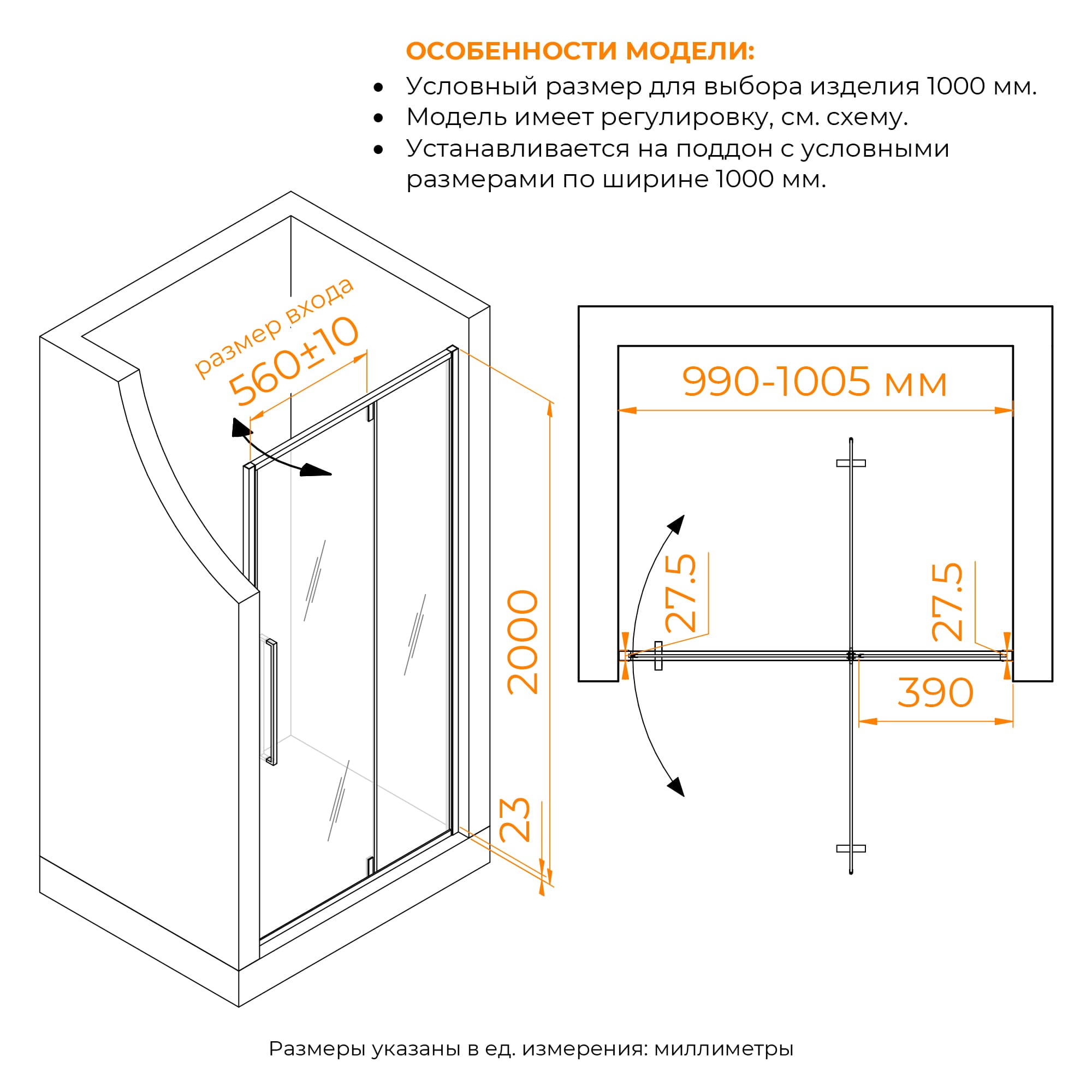 Конструкция дверей RGW SV-03B оснащена водонепроницаемыми стальными петлями, что обеспечивает долгий срок службы и надежную защиту от протечек воды. Высота общая двери составляет 2000 мм, что позволяет использовать ее в душевой кабине любого размера.