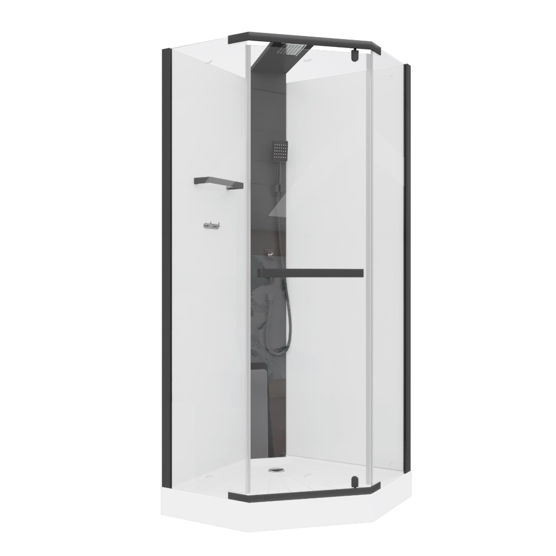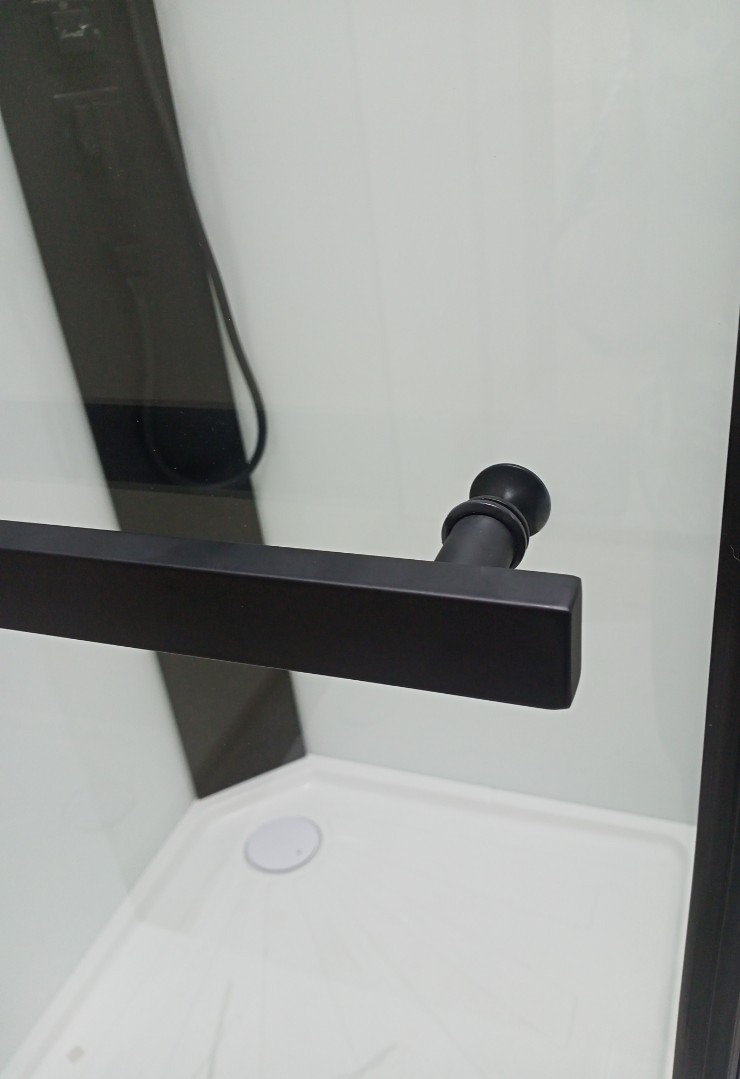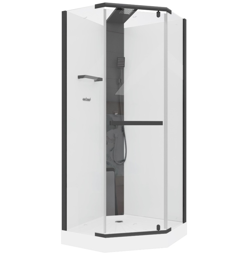 Стильная душевая кабина тонким черным профилем подчеркнет красоту Вашей ванной комнаты. Тропический и ручной душ на элегантной стойке черного цвета. Задние стенки из непрозрачного белого стекла.