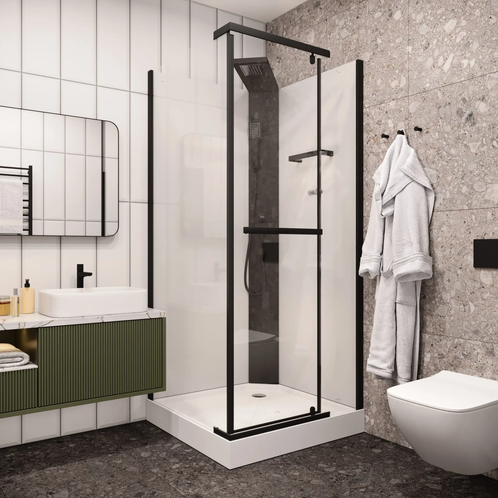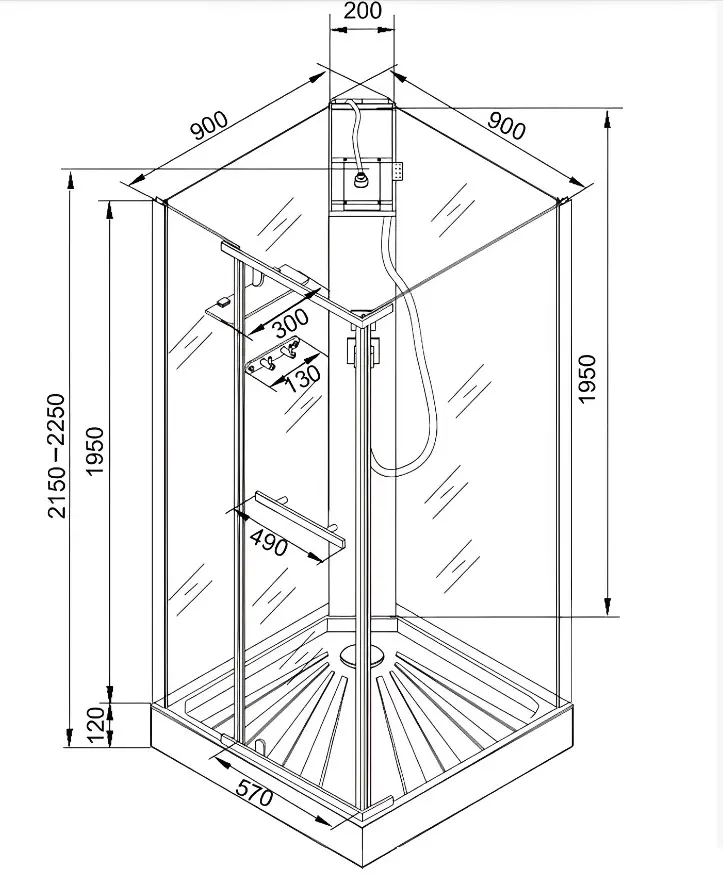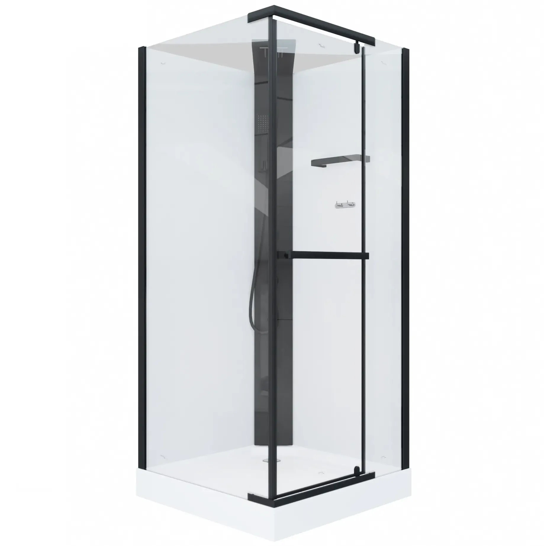 Стильная душевая кабина с черным профилем, с верхним и ручным душем. Дверь распашная, стекло 6мм.