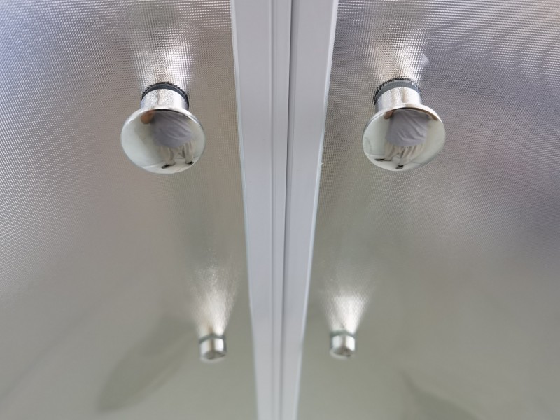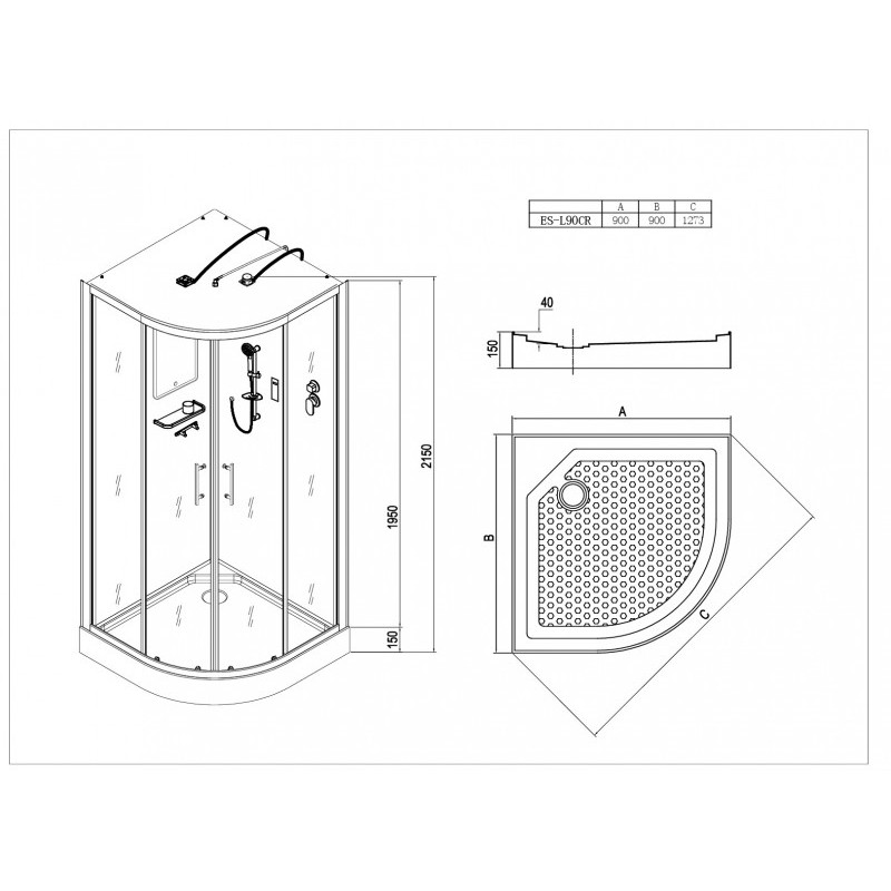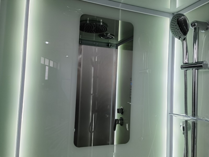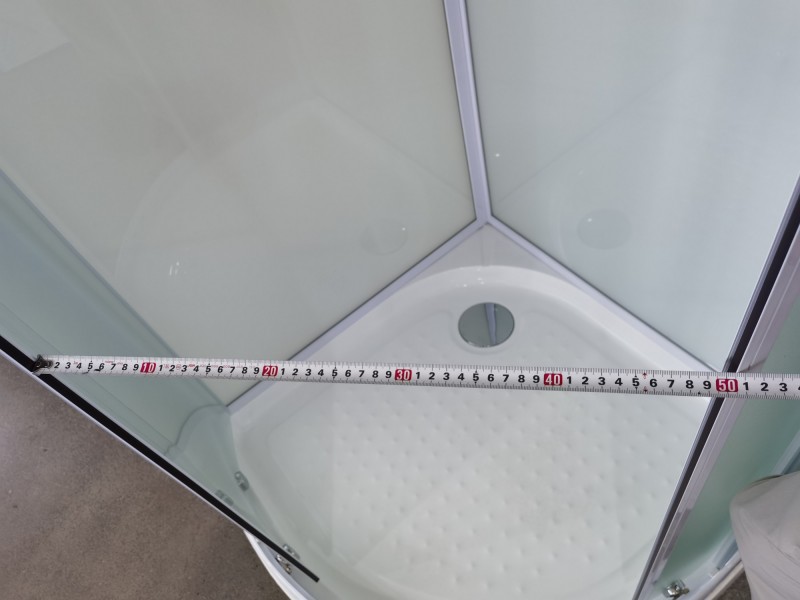 Низкий поддон. Сифон с гидрозатвором. Стекло: 5 мм, переднее - "матовое". заднее - "белое крашеное" с интегрированным зеркалом 65х30. Встроенная LED подсветка. Профиль: алюминий. Цвет: БЕЛЫЙ. На кабинах установлены: панель управления, вытяжной вентилятор, верхний душ с резиновыми соплами, FM радио. Комплектующие: стеклянная крыша, полочка со стаканчиком, смеситель, 3-х режимная лейка на стойке, мыльница, двойные ролики. Модель: "СR" - угловая