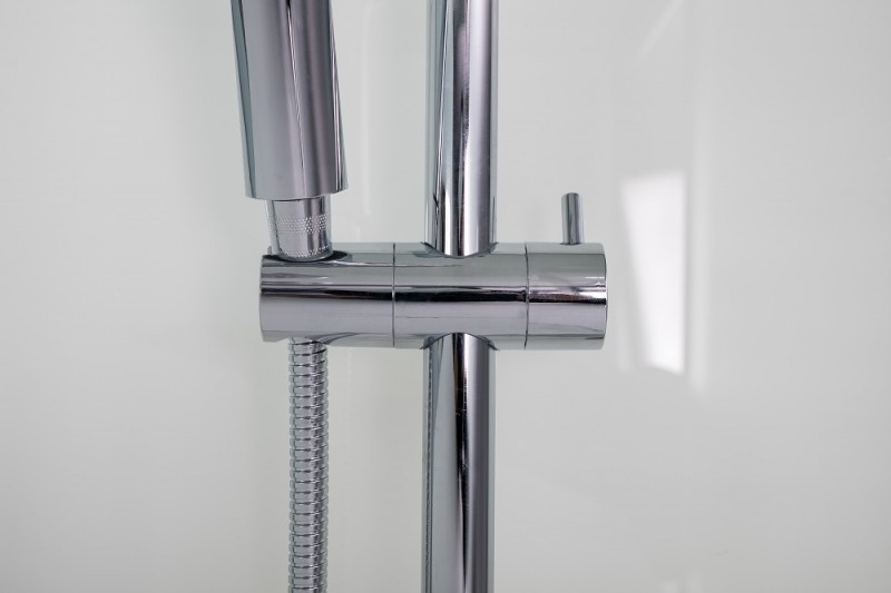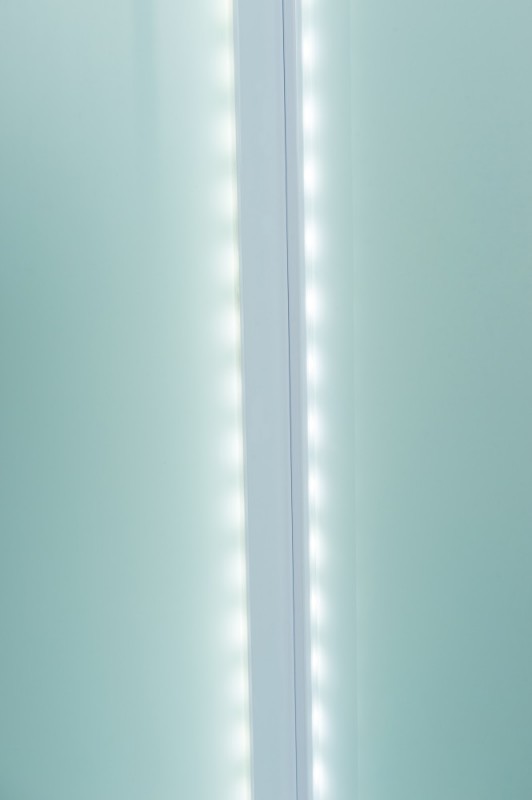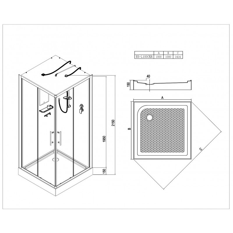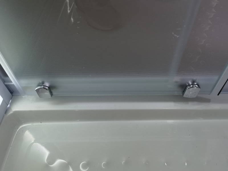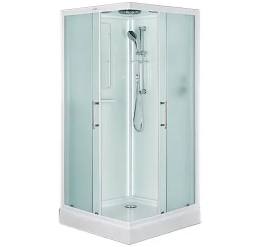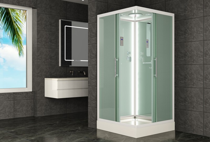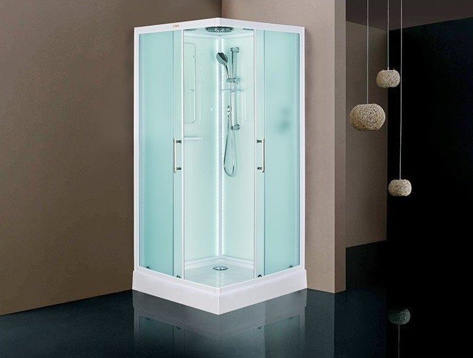 Низкий поддон. Сифон с гидрозатвором. Стекло: 5 мм, переднее - "матовое". заднее - "белое крашеное" с интегрированным зеркалом 65х30. Встроенная LED подсветка. Профиль: алюминий. Цвет: БЕЛЫЙ. На кабинах установлены: панель управления, вытяжной вентилятор, верхний душ с резиновыми соплами, FM радио. Комплектующие: стеклянная крыша, полочка со стаканчиком, смеситель, 3-х режимная лейка на стойке, мыльница, двойные ролики. Модель: "СКR" - квадратная.