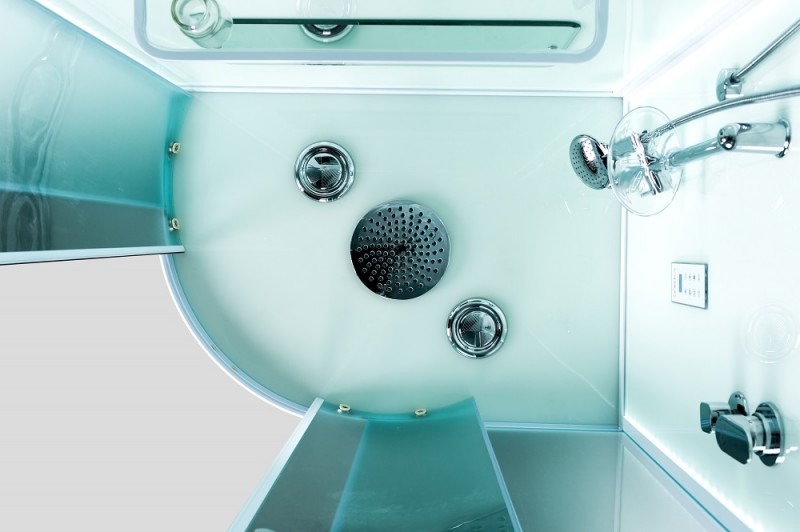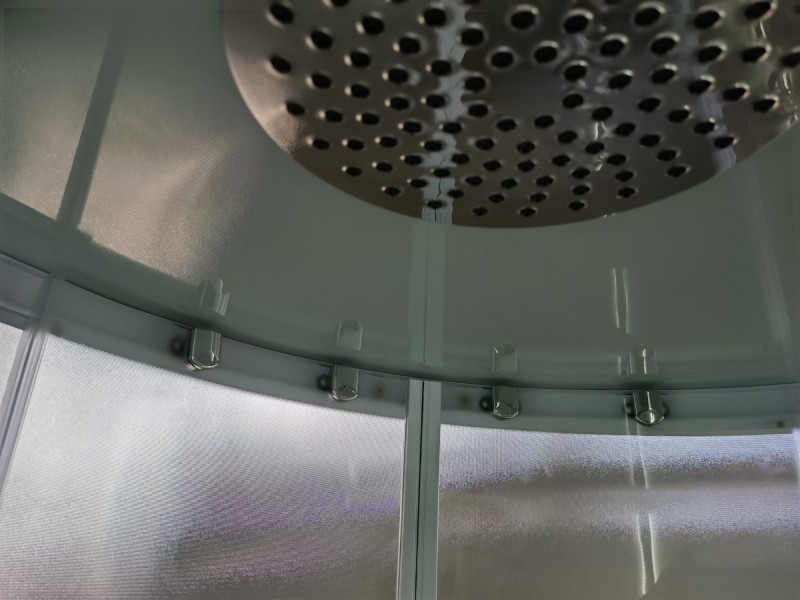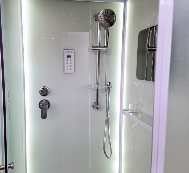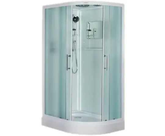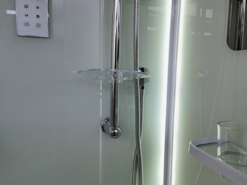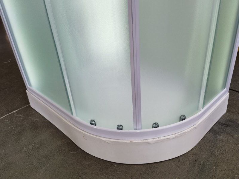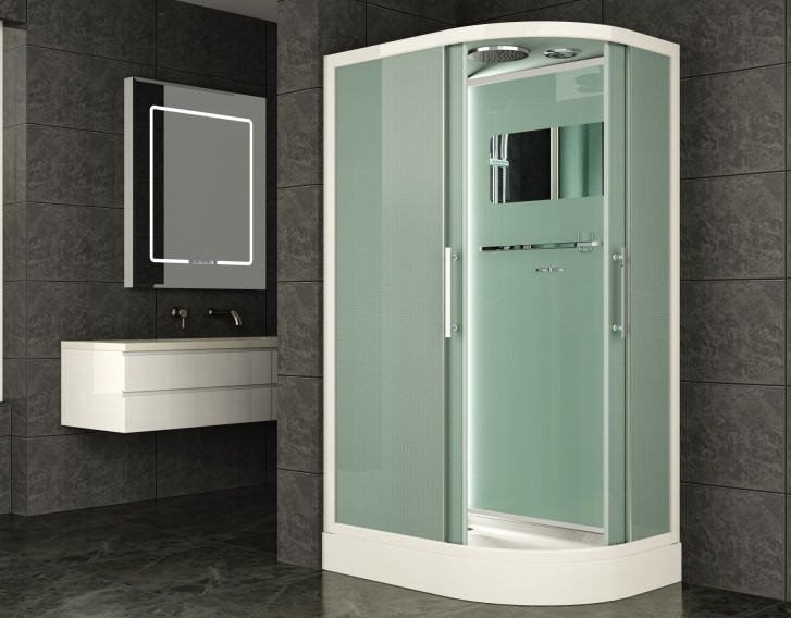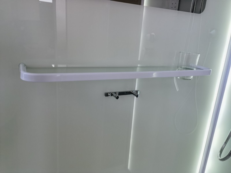Низкий поддон. Сифон с гидрозатвором. Стекло: 5 мм, переднее - "матовое". заднее - "белое крашеное" с интегрированным зеркалом 65х30. Встроенная LED подсветка. Профиль: алюминий. Цвет: БЕЛЫЙ. На кабинах установлены: панель управления, вытяжной вентилятор, верхний душ с резиновыми соплами, FM радио. Комплектующие: стеклянная крыша, полочка со стаканчиком, смеситель, 3-х режимная лейка на стойке, мыльница, двойные ролики. Модели: "СR" - угловая.