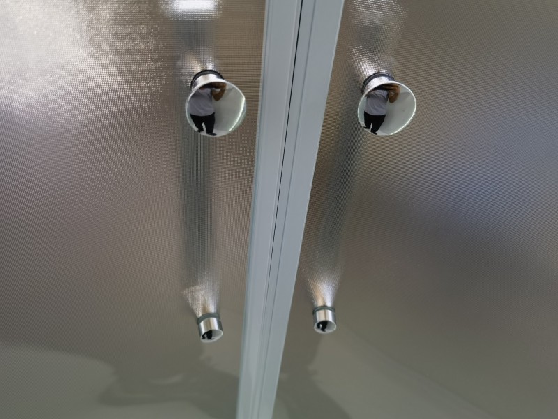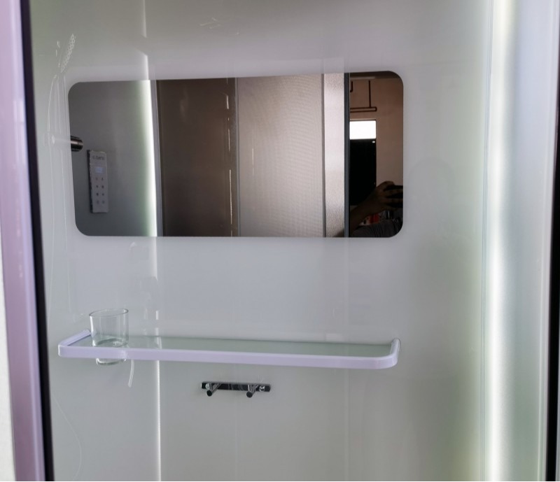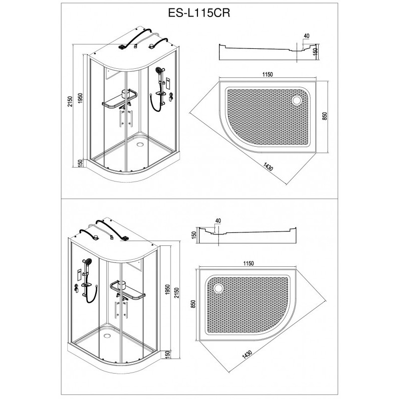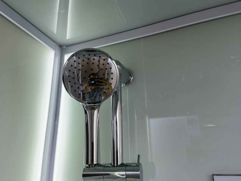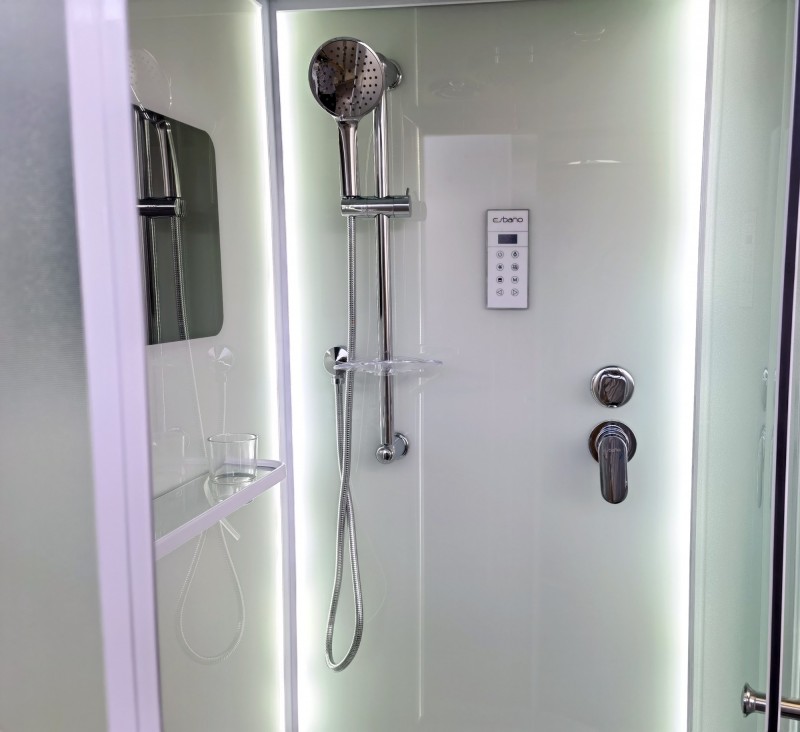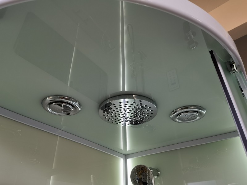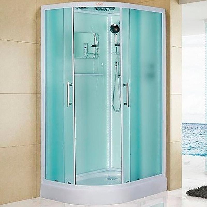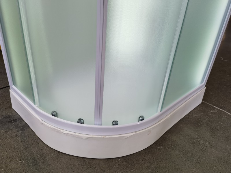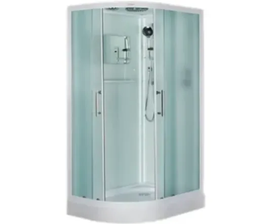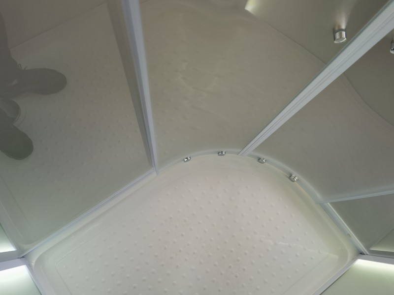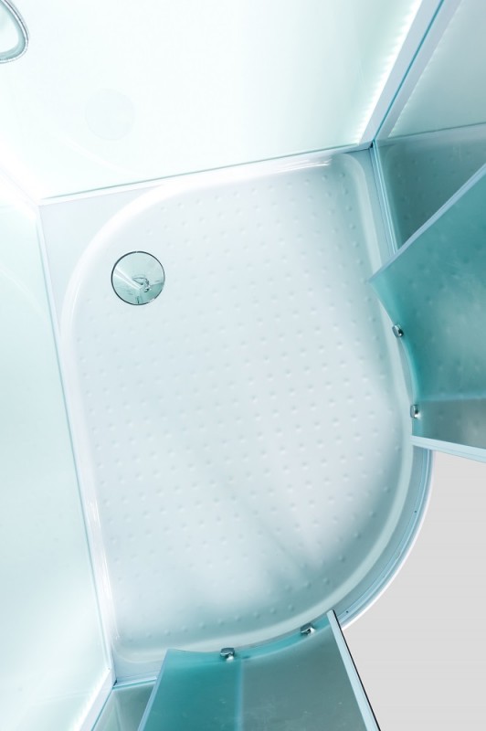 Низкий поддон. Сифон с гидрозатвором. Стекло: 5 мм, переднее - "матовое". заднее - "белое крашеное" с интегрированным зеркалом 65х30. Встроенная LED подсветка. Профиль: алюминий. Цвет: БЕЛЫЙ. На кабинах установлены: панель управления, вытяжной вентилятор, верхний душ с резиновыми соплами, FM радио. Комплектующие: стеклянная крыша, полочка со стаканчиком, смеситель, 3-х режимная лейка на стойке, мыльница, двойные ролики. Модели: "СR" - угловая.