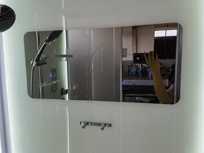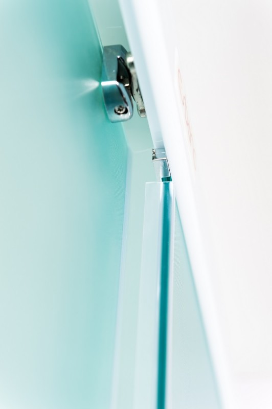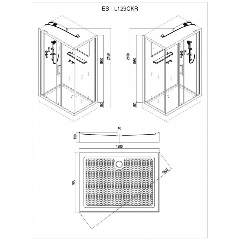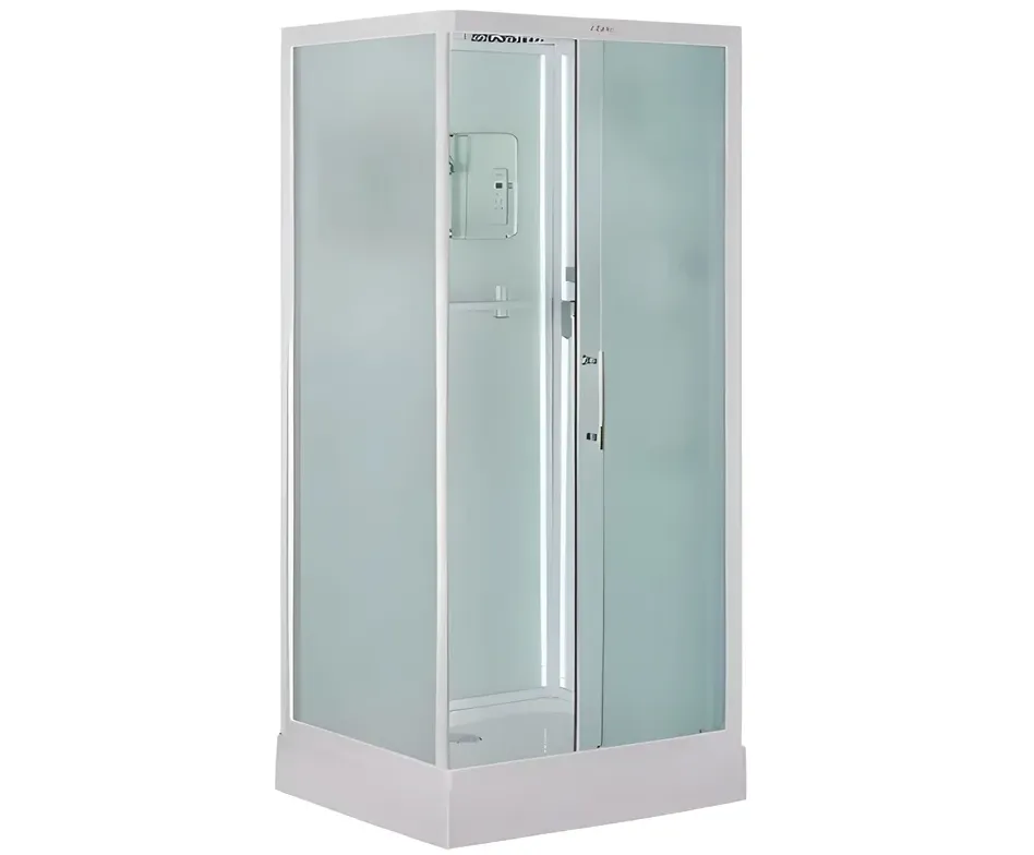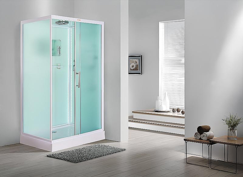 Низкий поддон. Сифон с гидрозатвором. Стекло: 5 мм, переднее - "матовое". заднее - "белое крашеное" с интегрированным зеркалом 65х30. Встроенная LED подсветка. Профиль: алюминий. Цвет: БЕЛЫЙ. На кабинах установлены: панель управления, вытяжной вентилятор, верхний душ с резиновыми соплами, FM радио. Комплектующие: стеклянная крыша, полочка со стаканчиком, смеситель, 3-х режимная лейка на стойке, мыльница, двойные ролики. Модель: "СКR" - квадратная.