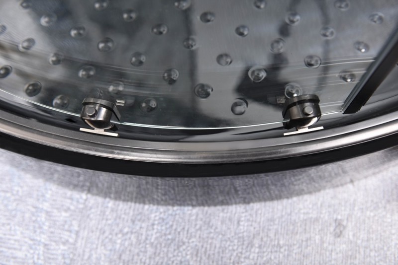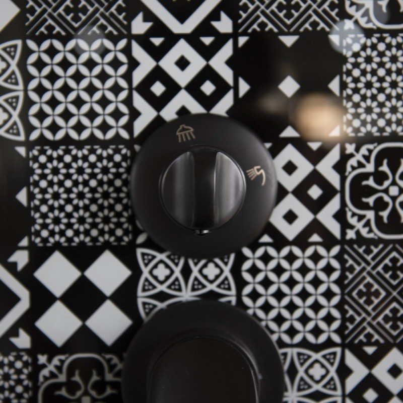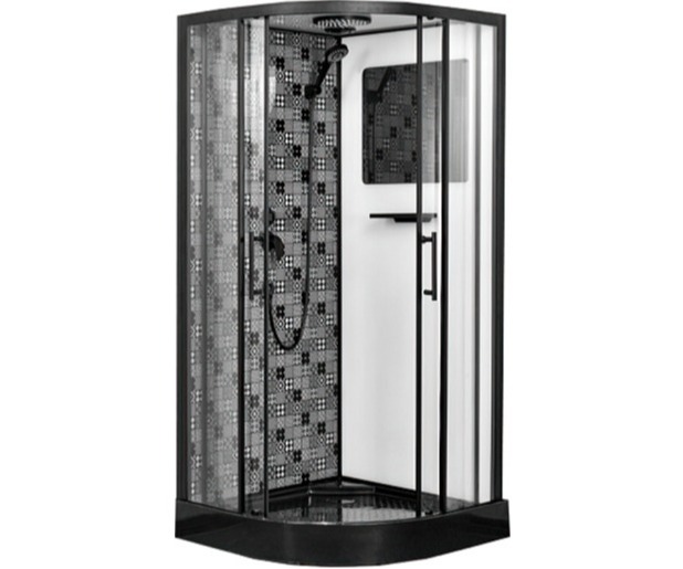 1. Поддон из ЧЁРНОГО акрила с бортиками по периметру - для бессиликоновой сборки. 2. Задние стенки: "стекло БЕЛОЕ крашеное с интегрированным зеркалом и стекло ДЕКОРИРОВАННОЕ", с профилями для "замковой" фиксации. 3. Передние стёкла - прозрачные ("easy clean"). 4. Полочка для шампуня.