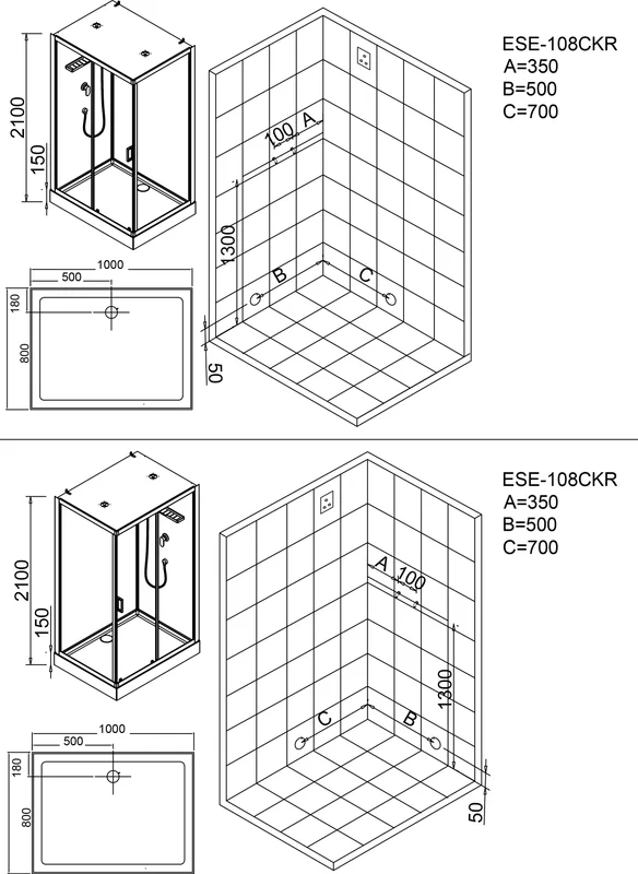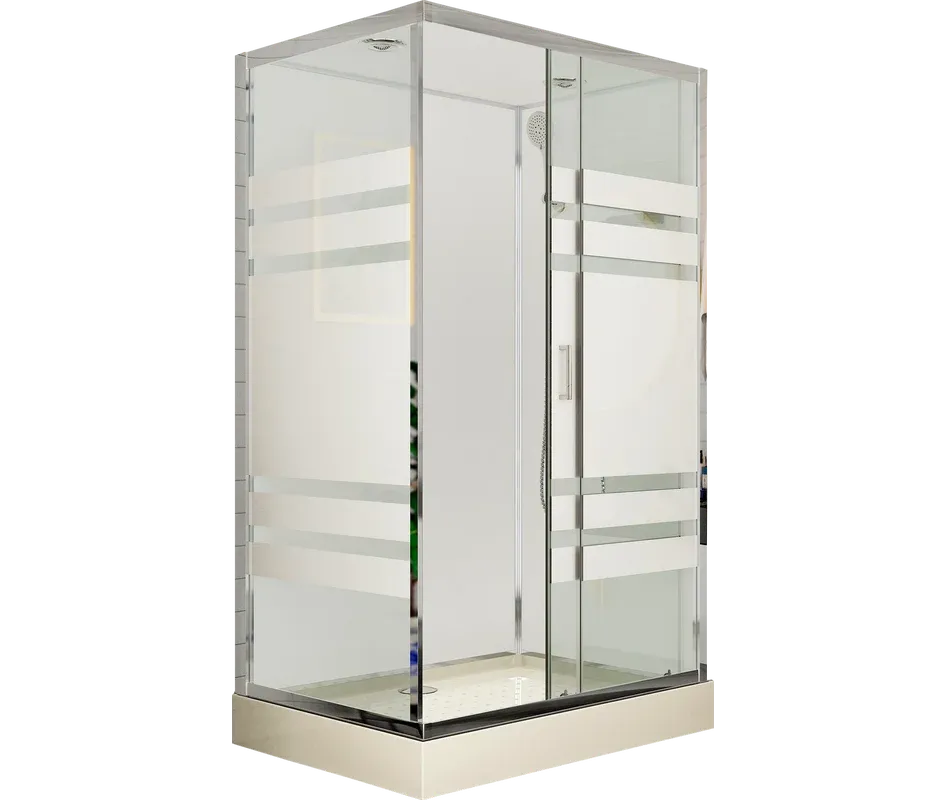 Низкий поддон с бортиками по периметру. Сифон с гидрозатвором. Лицевые стекла прозрачные (4 мм) с декором (шелкография). Задние стенки - белые "UV-панели" (3мм). Замковое соединений задних панелей. Алюминиевый профиль (глянцевый хром). Душевая лейка с регулируемым держателем. Двойные (спаренные) верхние ролики. 2 вентиляционные решётки (хром) в крыше.