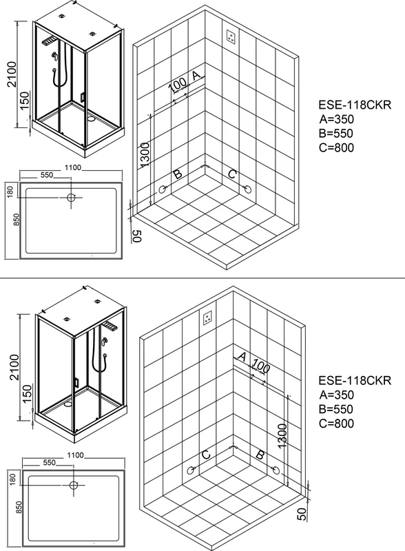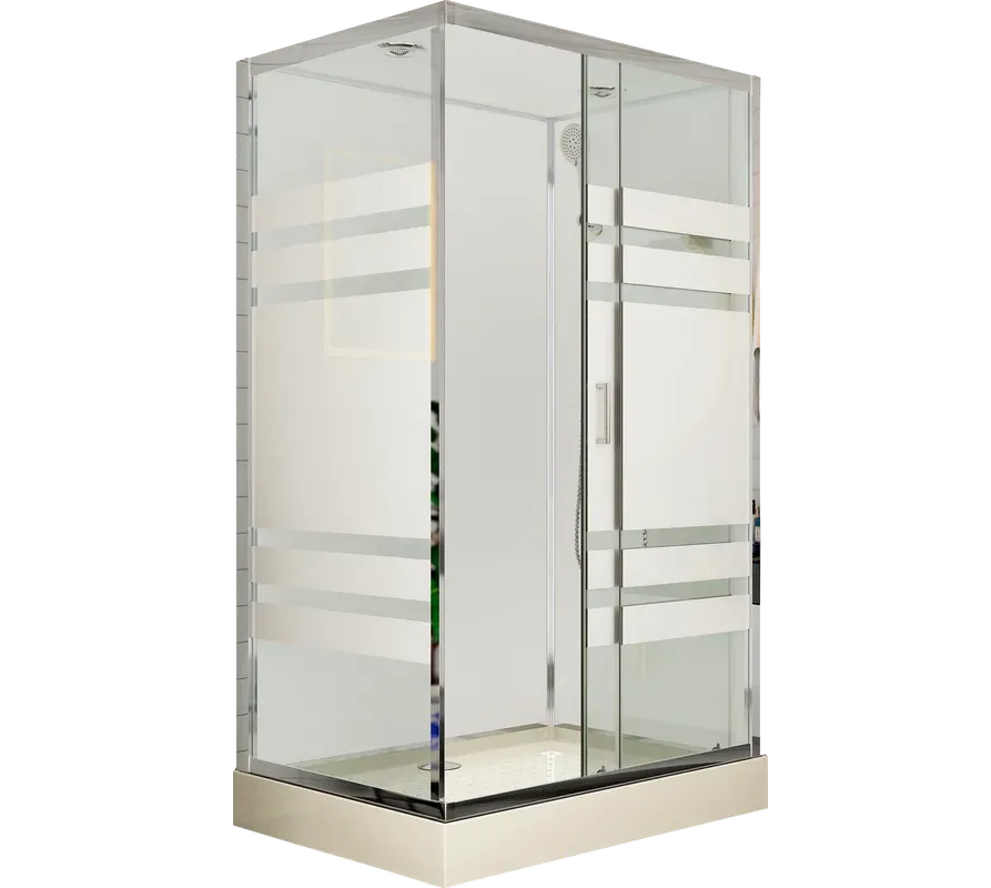 Низкий поддон с бортиками по периметру. Сифон с гидрозатвором. Лицевые стекла прозрачные (4 мм) с декором (шелкография). Задние стенки - белые "UV-панели" (3мм). Замковое соединений задних панелей. Алюминиевый профиль (глянцевый хром). Душевая лейка с регулируемым держателем. Двойные (спаренные) верхние ролики. 2 вентиляционные решётки (хром) в крыше.