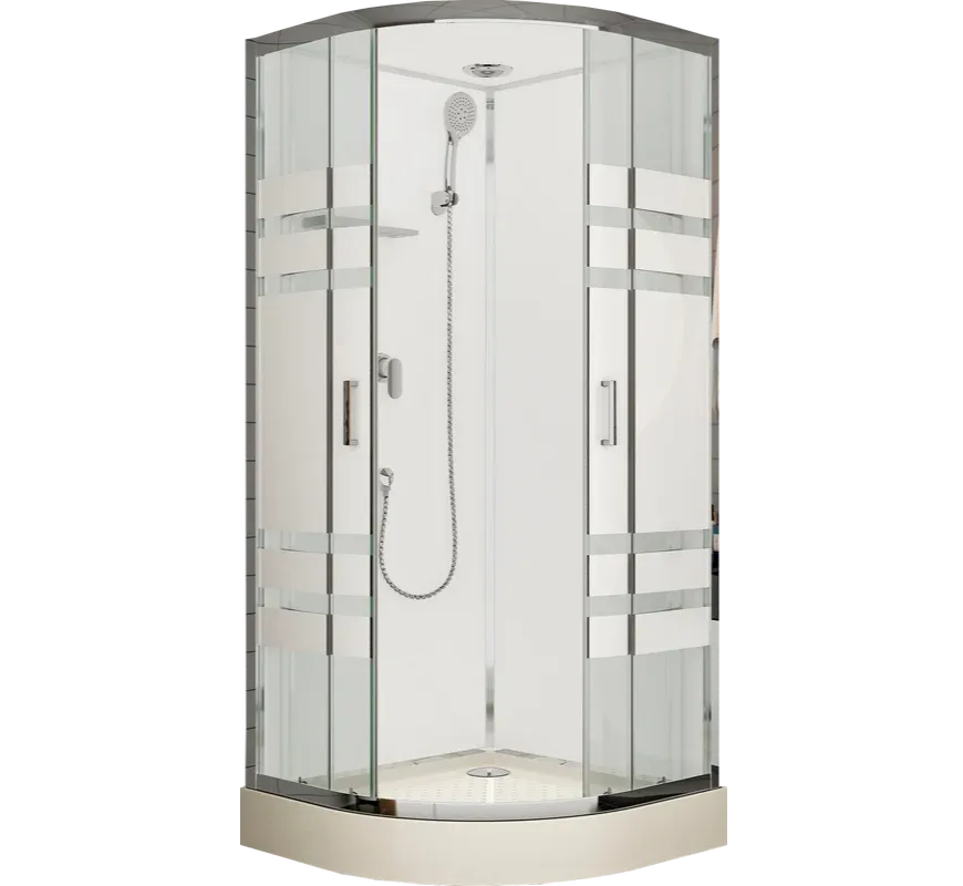 Низкий поддон с бортиками по периметру. Сифон с гидрозатвором. Лицевые стекла прозрачные (4 мм) с декором (шелкография). Задние стенки - белые "UV-панели" (3мм). Замковое соединений задних панелей. Алюминиевый профиль (глянцевый хром). Душевая лейка с регулируемым держателем. Двойные (спаренные) верхние ролики. Вентиляционная решётка (хром) в крыше.