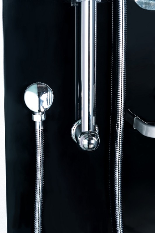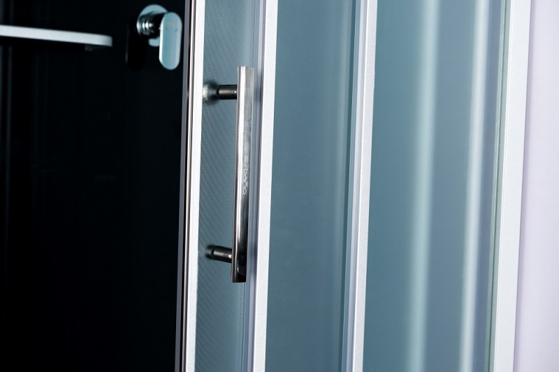 Низкий поддон. Сифон с гидрозатвором. Стекло: 5 мм, переднее - "матовое". заднее - "cерое крашеное" с интегрированным зеркалом 65х30. Комплектующие: полочка со стаканчиком, смеситель, 3-х режимная душевая лейка на стойке, мыльница, двойные ролики. Модель "СKR" - прямоугольная кабина со стеклянной крышей, верхним душем с прорезиненными соплами и вентиляционным отверстием.