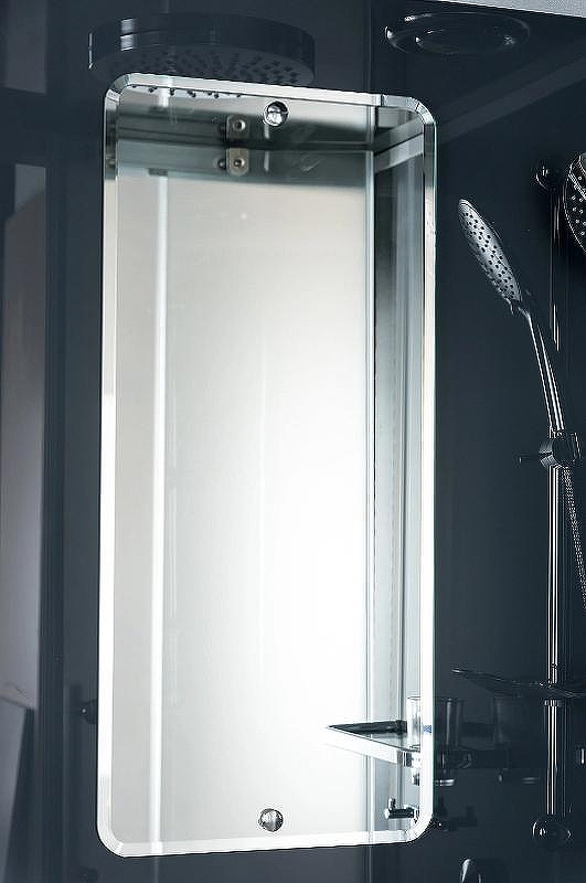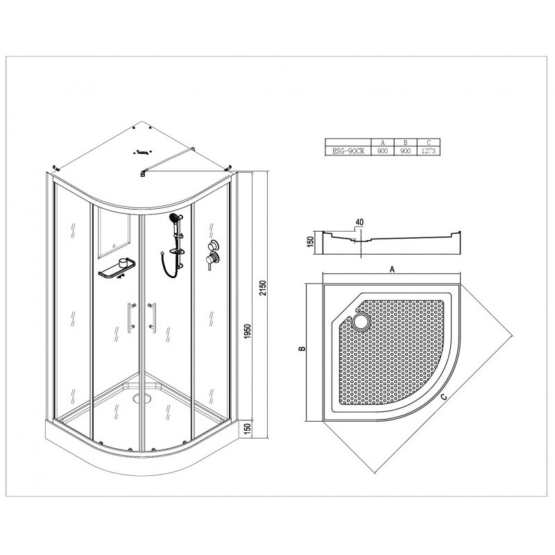 Низкий поддон. Сифон с гидрозатвором. Стекло: 5 мм, переднее - "матовое". заднее - "серое крашеное" с интегрированным зеркалом 65х30. Комплектующие: полочка со стаканчиком, смеситель, 3-х режимная душевая лейка на стойке, мыльница, двойные ролики. Модель "СR" - угловая кабина со стеклянной крышей, верхним душем с прорезиненными соплами и вентиляционным отверстием.