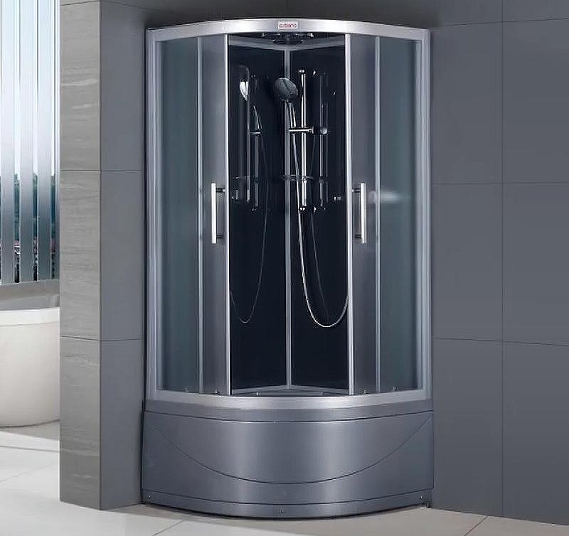 Высокий поддон. Сифон с гидрозатвором. Стекло: 5 мм, переднее - "матовое". заднее - "cерое крашеное" с интегрированным зеркалом 65х30. Комплектующие: полочка со стаканчиком, смеситель, 3-х режимная душевая лейка на стойке, мыльница, двойные ролики. Модель "СRB" - угловая кабина с высоким поддоном, стеклянной крышей, верхним душем с прорезиненными соплами и вентиляционным отверстием.