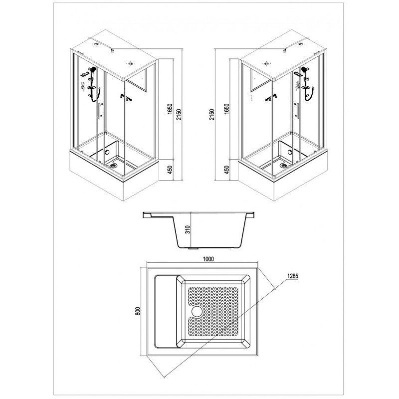 Высокий поддон. Сифон с гидрозатвором. Стекло: 5 мм, переднее - "матовое". заднее - "белое крашеное" с интегрированным зеркалом 65х30. Комплектующие: полочка со стаканчиком, смеситель, 3-х режимная душевая лейка на стойке, мыльница, двойные ролики. Модель "СКR" - квадратная/прямоугольная кабина со стеклянной крышей, верхним душем с прорезиненными соплами и вентиляционным отверстием.