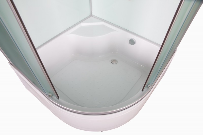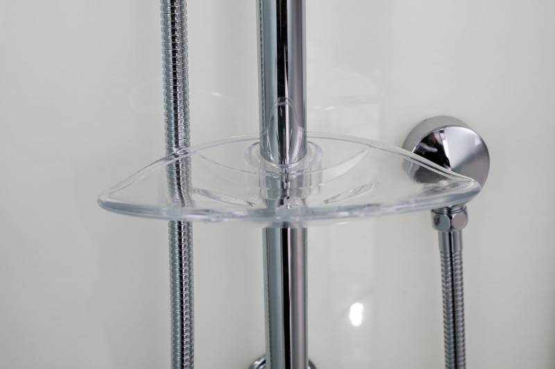 Высокий поддон. Сифон с гидрозатвором. Стекло: 5 мм, переднее - "матовое". заднее - "белое крашеное" с интегрированным зеркалом 65х30. Комплектующие: полочка со стаканчиком, смеситель, 3-х режимная душевая лейка на стойке, мыльница, двойные ролики. Модель "СRB" - угловая кабина с высоким поддоном, стеклянной крышей, верхним душем с прорезиненными соплами и вентиляционным отверстием.