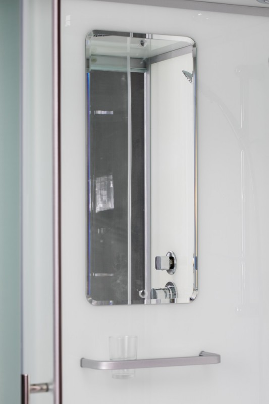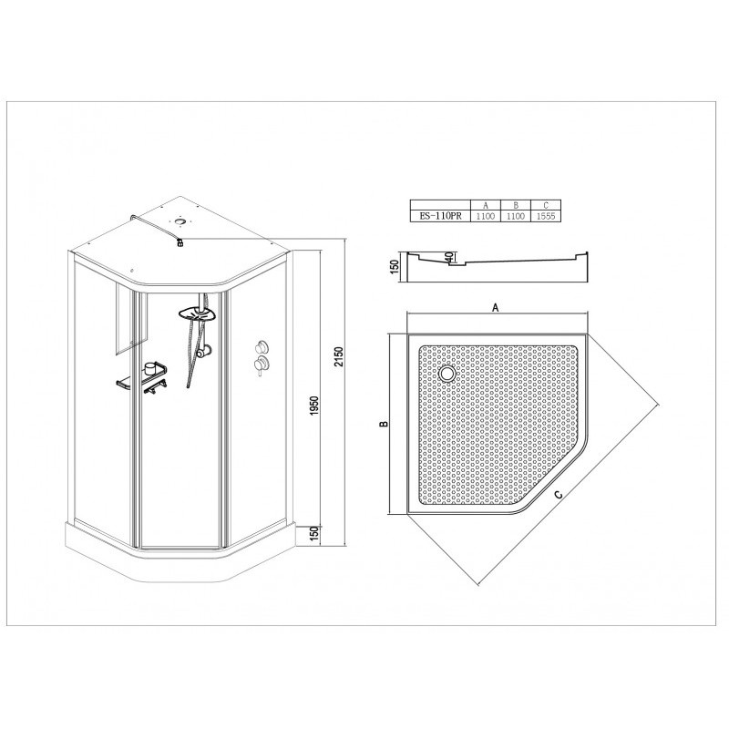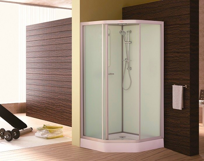 Низкий поддон. Сифон с гидрозатвором. Стекло: 5 мм, переднее - "матовое". заднее - "белое крашеное" с интегрированным зеркалом 65х30. Комплектующие: полочка со стаканчиком, смеситель, 3-х режимная душевая лейка на стойке, мыльница, двойные ролики. Модель "PR" - пятиугольная кабина со стеклянной крышей, верхним душем с прорезиненными соплами и вентиляционным отверстием.