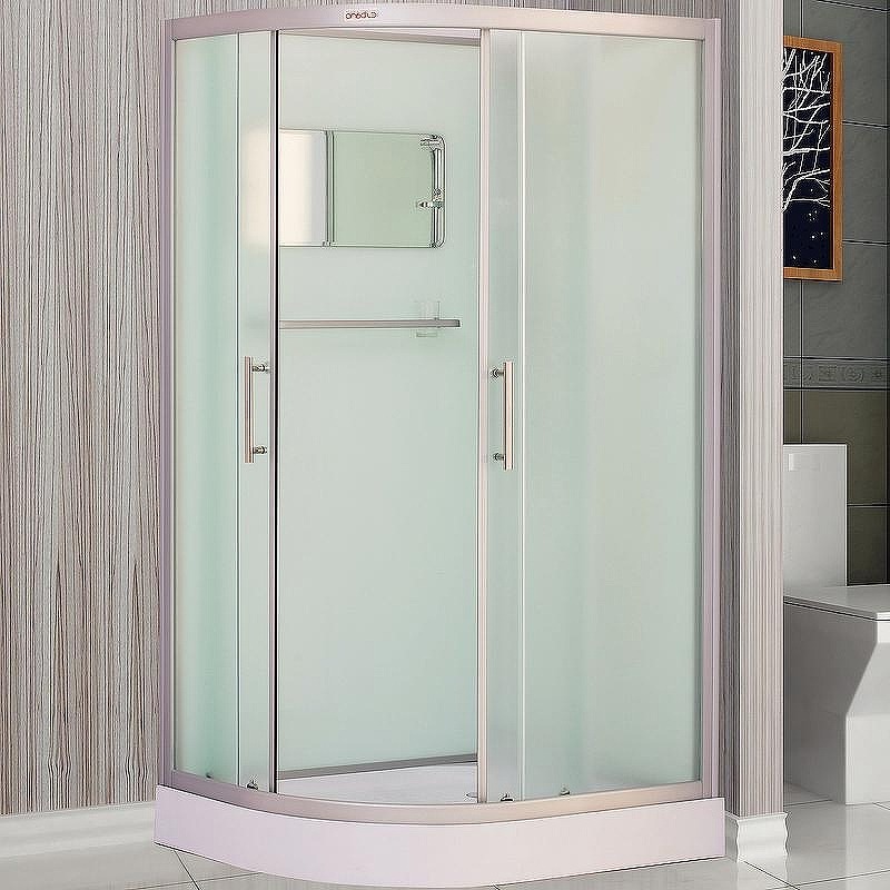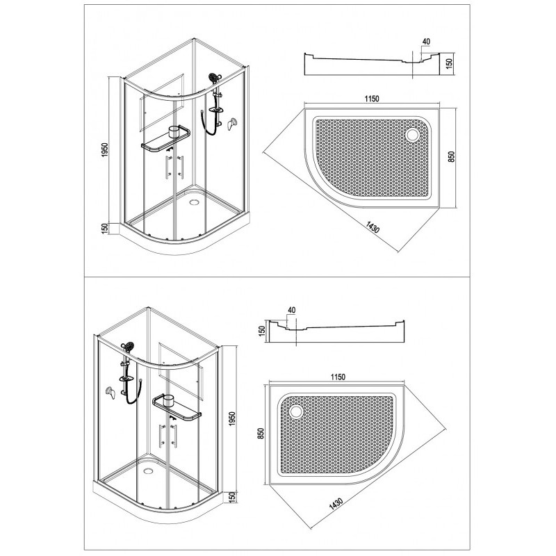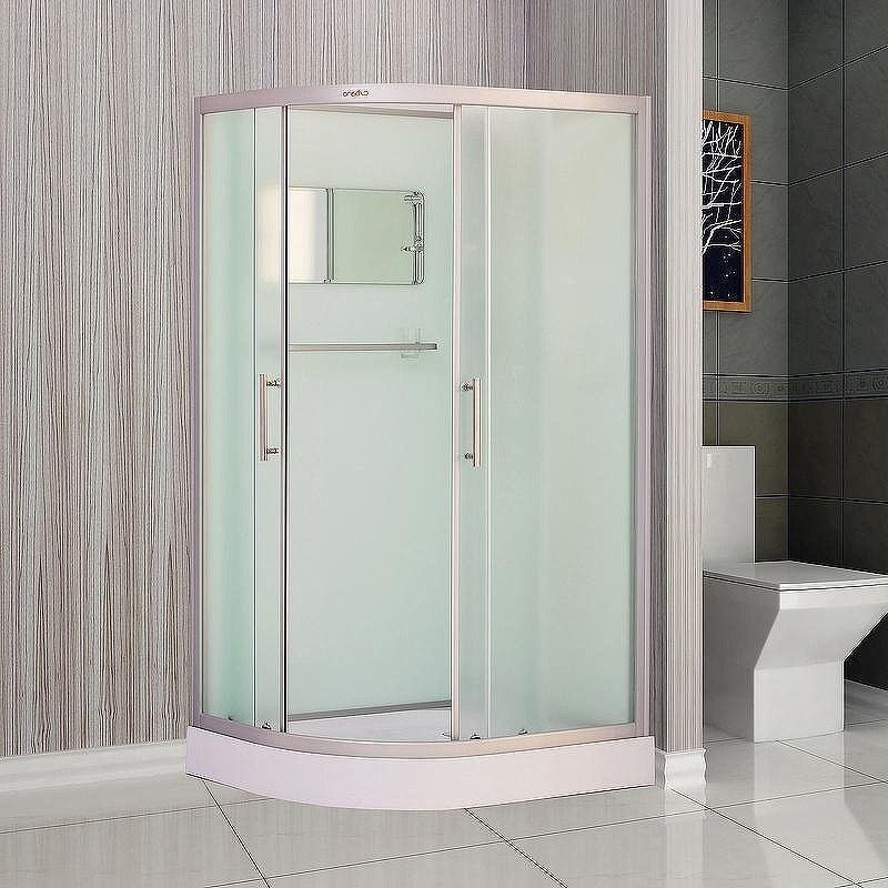 Низкий поддон. Сифон с гидрозатвором. Стекло: 5 мм, переднее - "матовое". заднее - "белое крашеное "с интегрированным зеркалом 65х30. Комплектующие: полочка со стаканчиком, смеситель, 3-х режимная душевая лейка на стойке, мыльница, двойные ролики. Модель "С" - угловая кабина (без крыши).