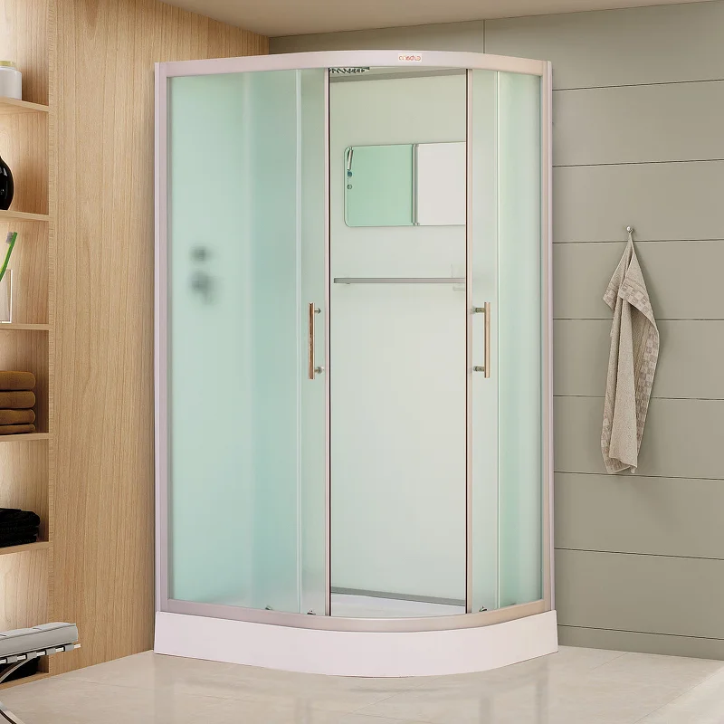 Низкий поддон. Сифон с гидрозатвором. Стекло: 5 мм, переднее - "матовое". заднее - "белое крашеное" с интегрированным зеркалом 65х30. Комплектующие: полочка со стаканчиком, смеситель, 3-х режимная душевая лейка на стойке, мыльница, двойные ролики. Модель "СR" - угловая кабина со стеклянной крышей, верхним душем с прорезиненными соплами и вентиляционным отверстием.
