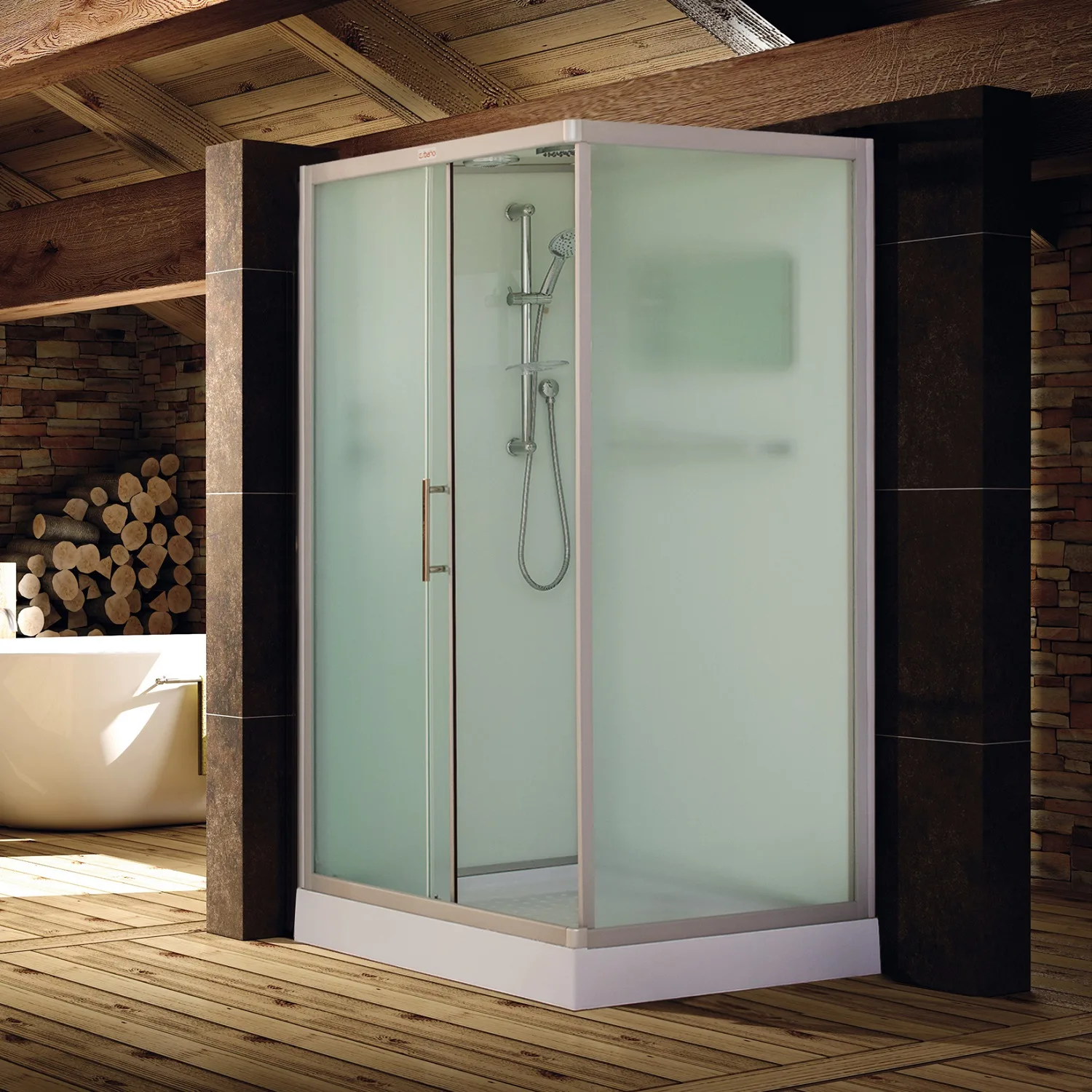 Низкий поддон. Сифон с гидрозатвором. Стекло: 5 мм, переднее - "матовое". заднее - "белое крашеное" с интегрированным зеркалом 65х30. Комплектующие: полочка со стаканчиком, смеситель, 3-х режимная душевая лейка на стойке, мыльница, двойные ролики. Модель "СКR" - квадратная/прямоугольная кабина со стеклянной крышей, верхним душем с прорезиненными соплами и вентиляционным отверстием.