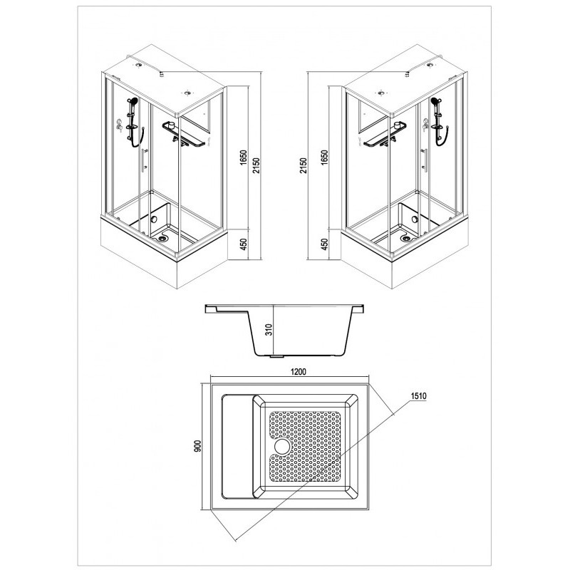 Высокий поддон. Слив-перелив, полуавтомат. Сифон с гидрозатвором. Стекло: 5 мм, передние - "матовые". задние - "белые крашенные" с интегрированным зеркалом. Комплектующие: полочка со стаканчиком, смеситель, 3-х режимная душевая лейка на стойке, мыльница, двойные ролики. Модель "СКR" - прямоугольная кабина со стеклянной крышей, верхним душем с прорезиненными соплами и вентиляционным отверстием.