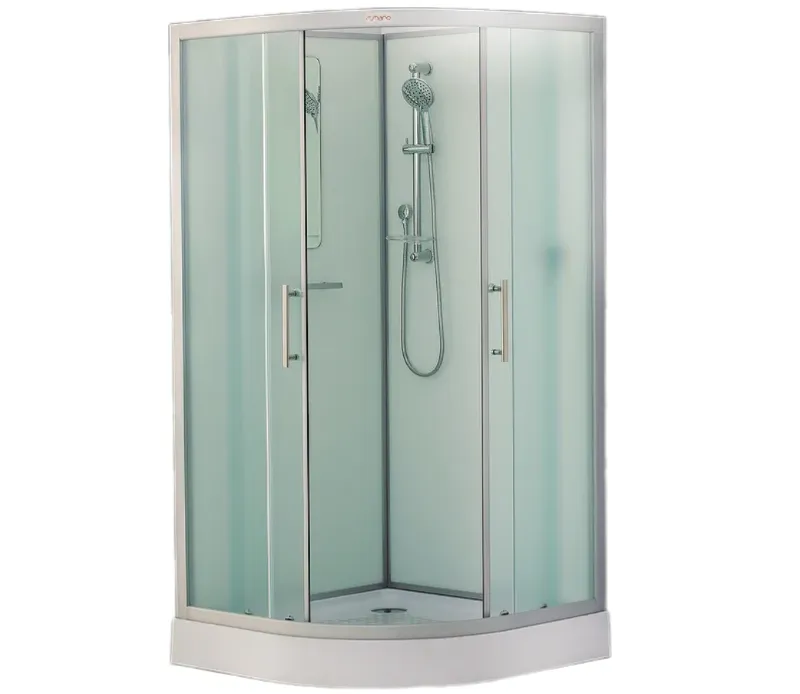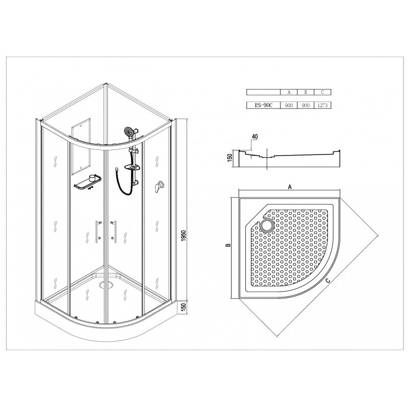Низкий поддон. Сифон с гидрозатвором. Стекло: 5 мм, переднее - "матовое". заднее - "белое крашеное" с интегрированным зеркалом 65х30. Комплектующие: полочка со стаканчиком, смеситель, 3-х режимная душевая лейка на стойке, мыльница, двойные ролики. Модель "С" - угловая кабина (без крыши).