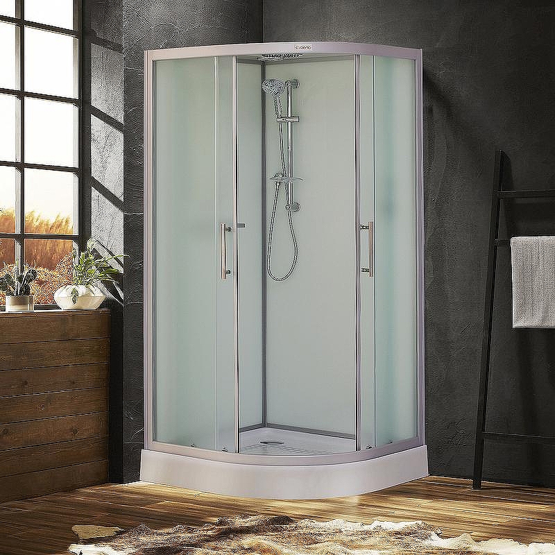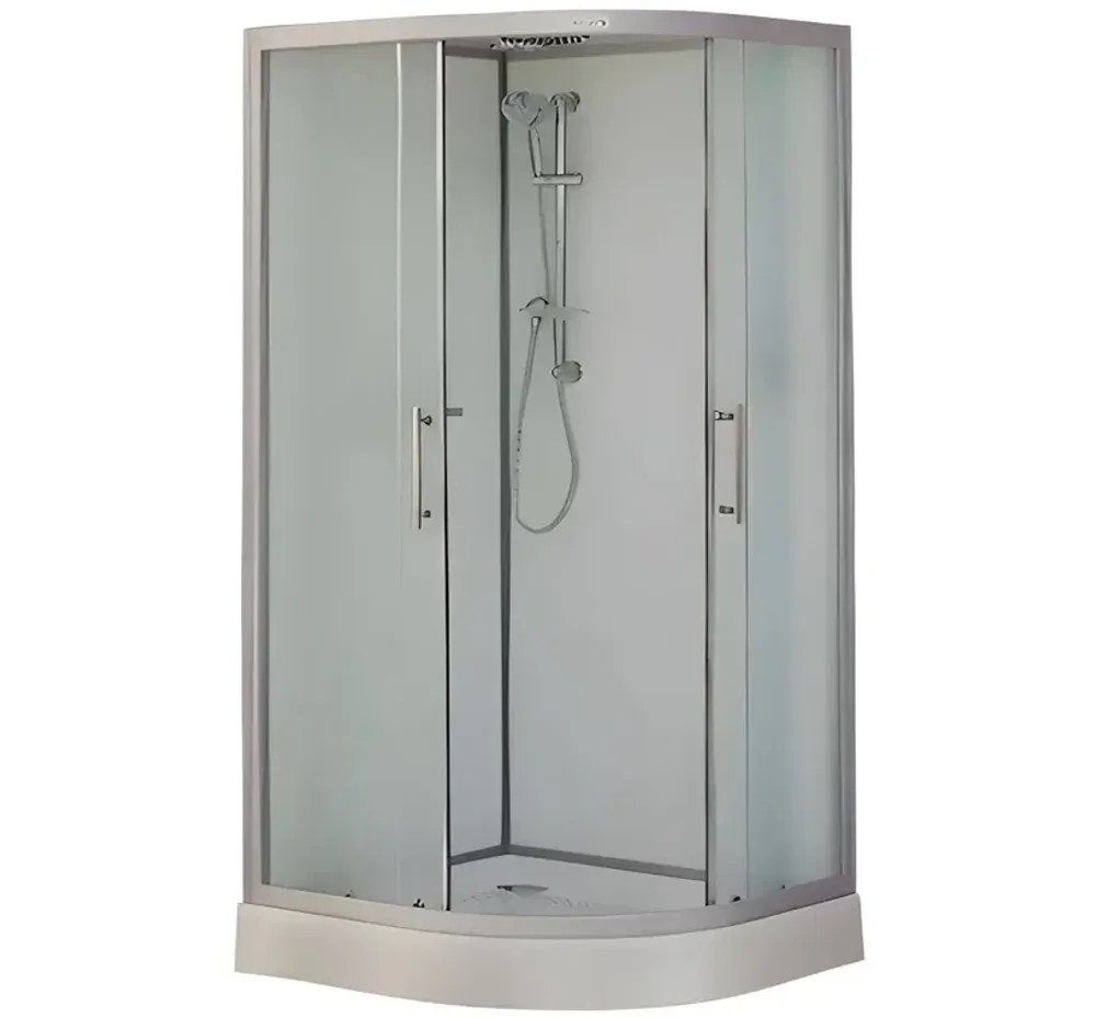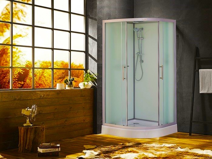 Низкий поддон. Сифон с гидрозатвором. Стекло: 5 мм, переднее - "матовое". заднее - "белое крашеное" с интегрированным зеркалом 65х30. Комплектующие: полочка со стаканчиком, смеситель, 3-х режимная душевая лейка на стойке, мыльница, двойные ролики. Модель "СR" - угловая кабина со стеклянной крышей, верхним душем с прорезиненными соплами и вентиляционным отверстием.