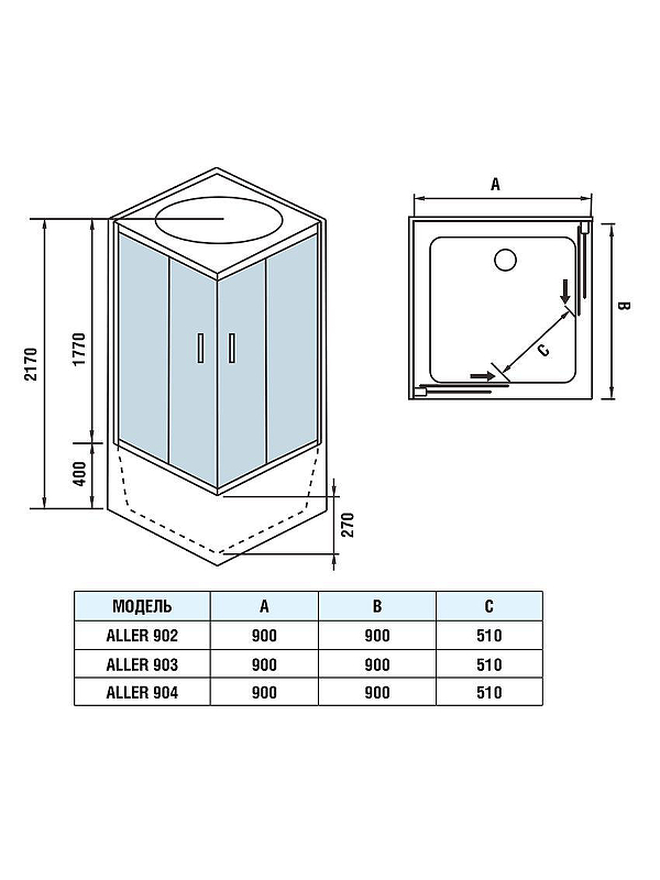 • Размеры (ШхДхВ): 90х90х217 см. Ширина входа: 51 см.