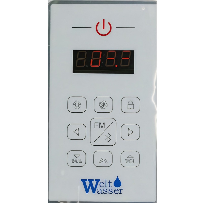 WeltWasser ALLER 904 – качественная душевая кабина с богатым функционалом, привлекающая простотой в эксплуатации. Конструкция оснащена универсальной дверью, которая после установки раздвигается влево и вправо. Передние и боковые стенки кабины выполнены из надёжного и прочного закаленного стекла толщиной 5 миллиметров. Ему не страшны перепады температур, случайные удары. Задняя стенка изготавливается из идентичного стекла, но окрашивается в белую цветовую гамму. В зависимости от собственных предпочтений, человек может пользоваться ручным душем, выбирая наиболее оптимальное для себя положение, либо верхним. Верхний LED свет создает приятное освещение внутри кабины. Сенсорный пульт оснащен функцией bluetooth и вы можете наслаждаться любимой музыкой с телефона. Смеситель Термостат поможет выбрать и зафиксировать оптимальную температуру для принятия душа. Две регулируемые гидромассажные форсунки сделают приятный массаж. Монтаж кабины осуществляется без силикона. Внутри конструкции свободно помещается высокий человек, ведь её внутренняя высота составляет два метра.