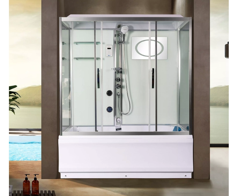 WeltWasser EMMER 150/85/55 – качественная душевая кабина с богатым функционалом, привлекающая простотой в эксплуатации. Конструкция оснащена универсальной дверью, которая после установки раздвигается влево и вправо. Передние и боковые стенки кабины выполнены из надёжного и прочного закаленного стекла толщиной 6 миллиметров. Ему не страшны перепады температур, случайные удары. Задняя стенка изготавливается из идентичного стекла, но окрашивается в белую цветовую гамму. В зависимости от собственных предпочтений, человек может пользоваться ручным душем, выбирая наиболее оптимальное для себя положение, либо верхним. Верхний LED свет создает приятное освещение внутри кабины. Сенсорный пульт оснащен функцией bluetooth и вы можете наслаждаться любимой музыкой с телефона. Смеситель Две регулируемые гидромассажные форсунки сделают приятный массаж. Сиденье из дуба с влагонепроницаемой пропиткой прилагается к поддону и можно воспользоваться им для принятия приятных процедур. Монтаж кабины осуществляется без силикона. Внутри конструкции свободно помещается высокий человек, ведь её внутренняя высота составляет два метра.